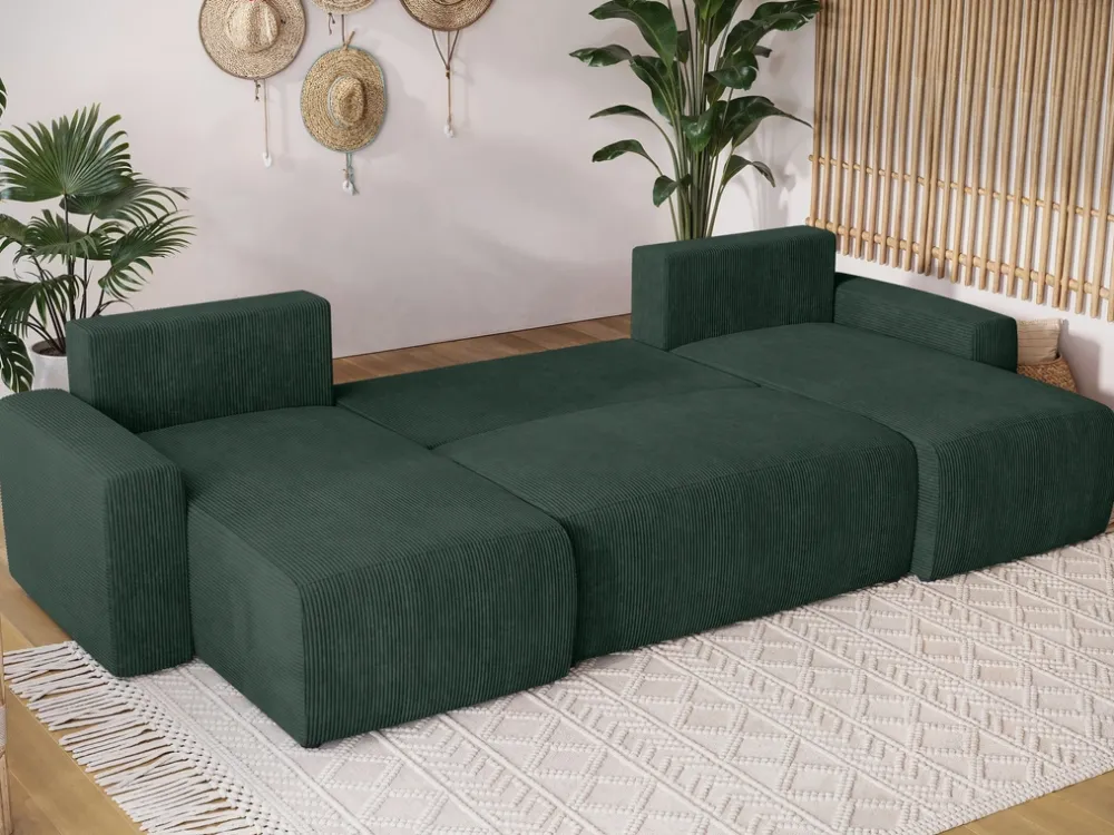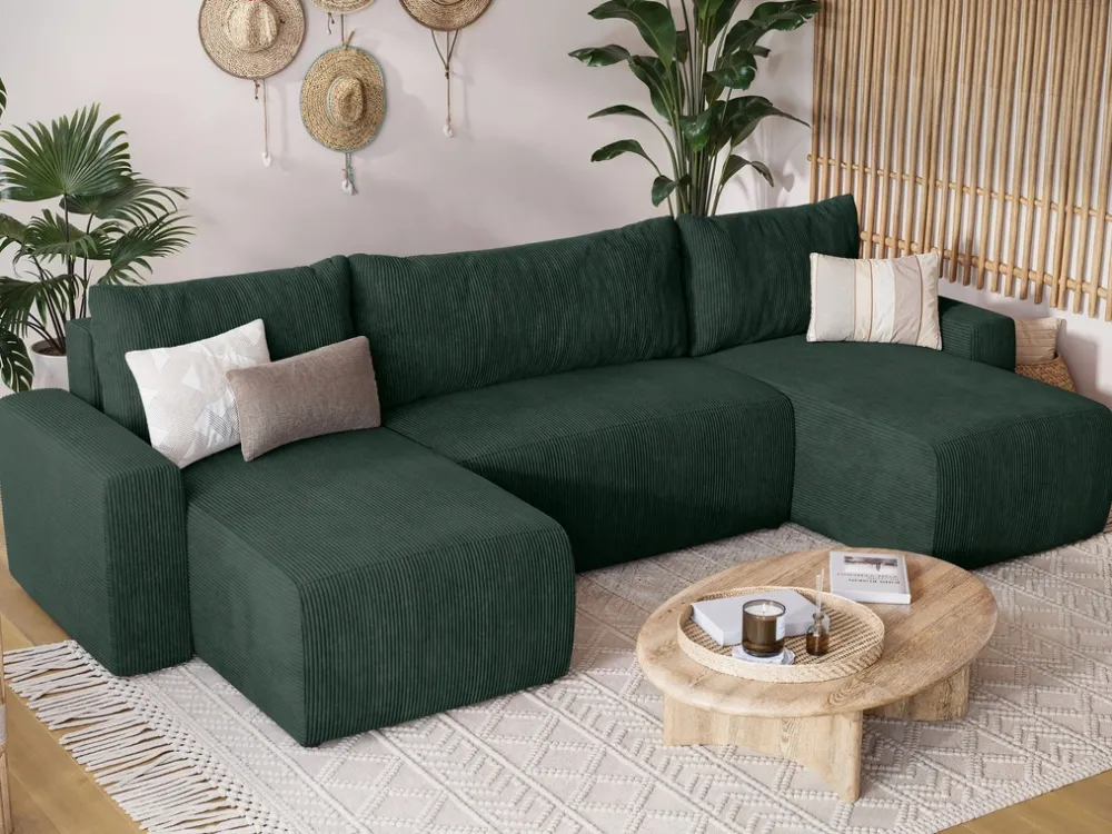 Narożnik w kształcie U z funkcją spania 125×275 cm PLUSH U to idealne rozwiązanie dla każdego, kto ceni sobie wygodę i praktyczność. Dzięki swojemu przemyślanemu designowi doskonale sprawdzi się zarówno w przestronnych salonach, jak i w mniejszych pomieszczeniach, oferując mnóstwo miejsca do siedzenia i spania.