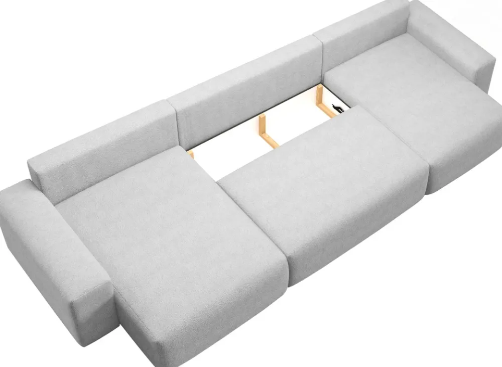 Rozkładany narożnik w kształcie U jest obity przyjemną w dotyku tkaniną typu baranek CENTAUR, która dodaje mu elegancji i współgra z różnymi aranżacjami wnętrz. Duży narożnik w kształcie U jest także bardzo praktyczny – wyposażono go w pojemnik na pościel, który pozwala na przechowywanie niezbędnych akcesoriów i tekstyliów do popołudniowych drzemek i okazjonalnych noclegów. Narożnik w kształcie U dzięki tyłowi obitemu tą samą tkaniną, co reszta mebla jest wolnostojący, pozwala to na swobodne ustawienie go w każdym miejscu salonu.