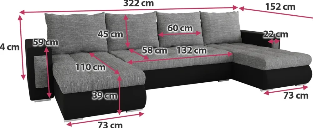 Stwórz idealne miejsce do relaksu z narożnikiem MERLIN U, który łączy nowoczesny design z funkcjonalnością. Jego przestronny kształt w literę U zapewnia dużo miejsca do wypoczynku, a dzięki funkcji spania i pojemnikowi na pościel jest niezwykle praktyczny. Dostępny w dwóch stylowych wersjach kolorystycznych, doskonale dopasuje się do Twojego wnętrza.
