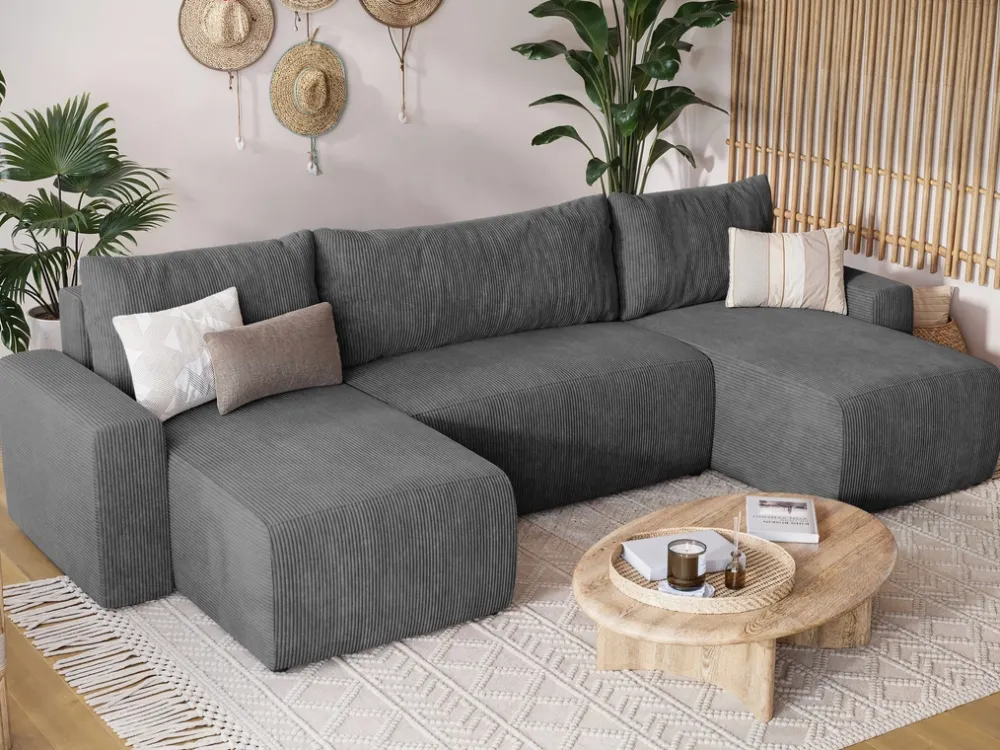 Narożnik w kształcie U z funkcją spania 125×275 cm PLUSH U to idealne rozwiązanie dla każdego, kto ceni sobie wygodę i praktyczność. Dzięki swojemu przemyślanemu designowi doskonale sprawdzi się zarówno w przestronnych salonach, jak i w mniejszych pomieszczeniach, oferując mnóstwo miejsca do siedzenia i spania.