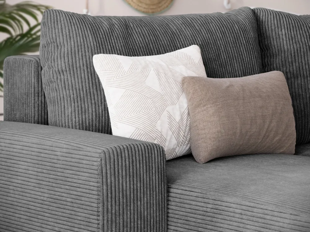 - Narożnik posiada tapicerowane plecy w tej samej tkaninie co reszta mebla, oznacza to, że można ustawić mebel nawet pośrodku salonu.