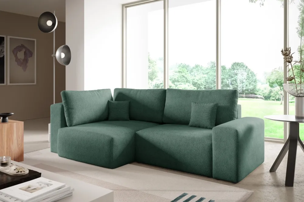 Nowoczesny narożnik z funkcją spania CAMILO DUO to idealne połączenie funkcjonalności i wyjątkowego designu, które wyróżnia się na tle innych mebli. Jest to mebel obity tkaniną boucle, co dodaje mu unikatowego charakteru i tekstury. Idealnie komponuje się zarówno w nowoczesnych, jak i bardziej klasycznych wnętrzach, będąc centralnym punktem salonu.