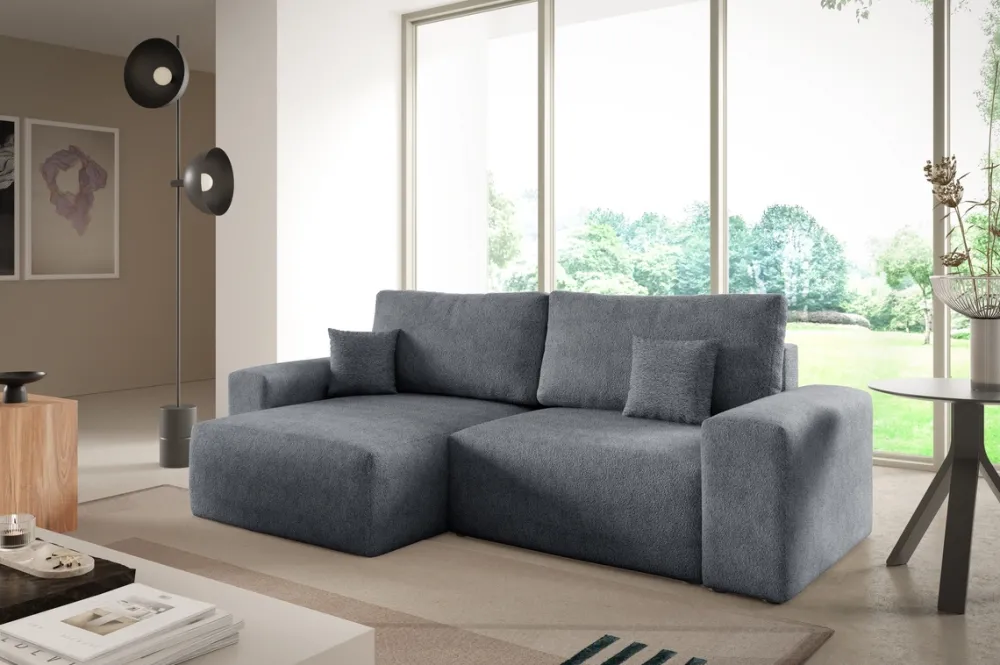 Nowoczesny narożnik z funkcją spania jest wyposażony w automat DL, który ułatwia rozkładanie, a obicie narożnika również od tyłu sprawia, że mebel jest wolnostojący, przez co możesz go ustawić w dowolnym miejscu w pomieszczeniu.