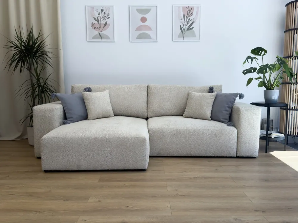 - Wprowadź do salonu nowoczesny design z rozkładanym narożnikiem CAMILO. Narożnik obity został miękką tkaniną typu baranek. Wyposażony jest w pojemnik na pościel, ułatwiający rozkładanie automat DL, a także komplet miękkich poduch.