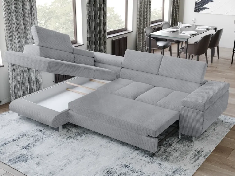 - Narożnik do salonu ANTON obity został w sztruksowej tkaninie, która wprowadzi do salonu nowoczesny design i podkreśli charakter aranżacji. Rozkładany narożnik posiada również wysokie metalowe nóżki, funkcję spania, a także pojemnik na pościel.