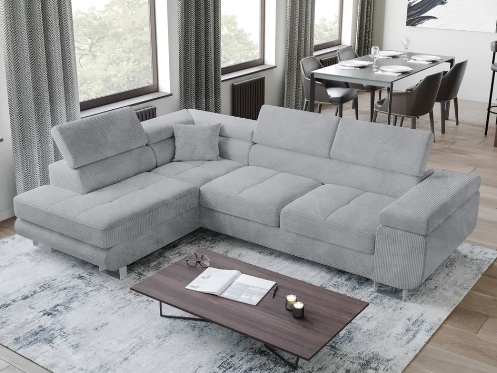 Szary narożnik do salonu obity jest sztruksową tkaniną Poso, która nigdy nie wychodzi z mody. Jej charakterystyczna faktura nadaje wnętrzom ciepła, przytulności i niepowtarzalnego charakteru. Sztruks również świetnie komponuje się z różnymi stylami wnętrz.