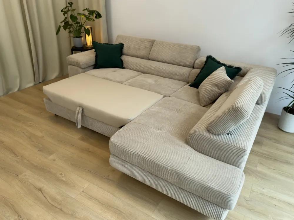 Kanapa narożna do salonu wyposażona jest w funkcję spania rozkładaną łatwym w obsłudze automatem typu delfin. Perfekcyjne rozwiązanie dla gości, którzy zdecydują się zostać na noc lub na weekendowe maratony filmowe z rodziną.