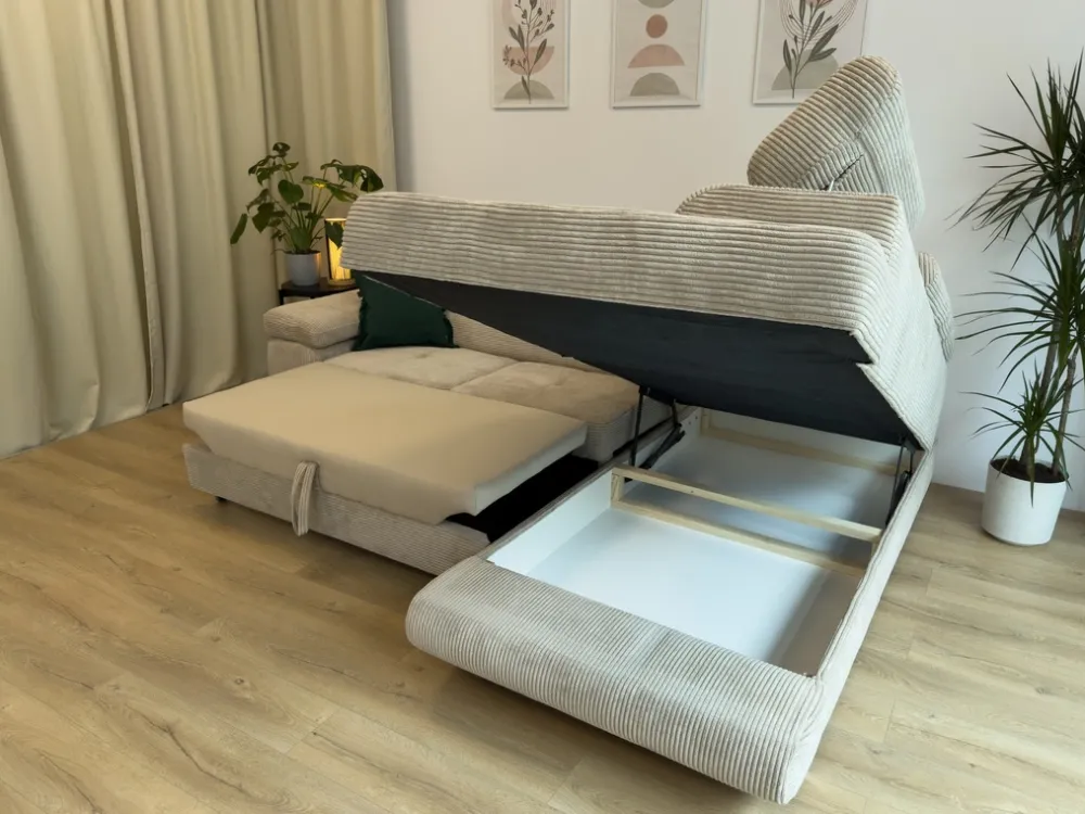 W otomanie narożnika z funkcją spania znajdziesz praktyczny i przestronny pojemnik na pościel. Będzie to doskonałe miejsce do przechowywania kołder czy poduszek, zwalniając tym samym miejsce w szafach.