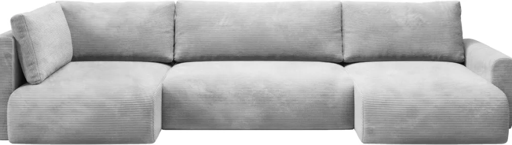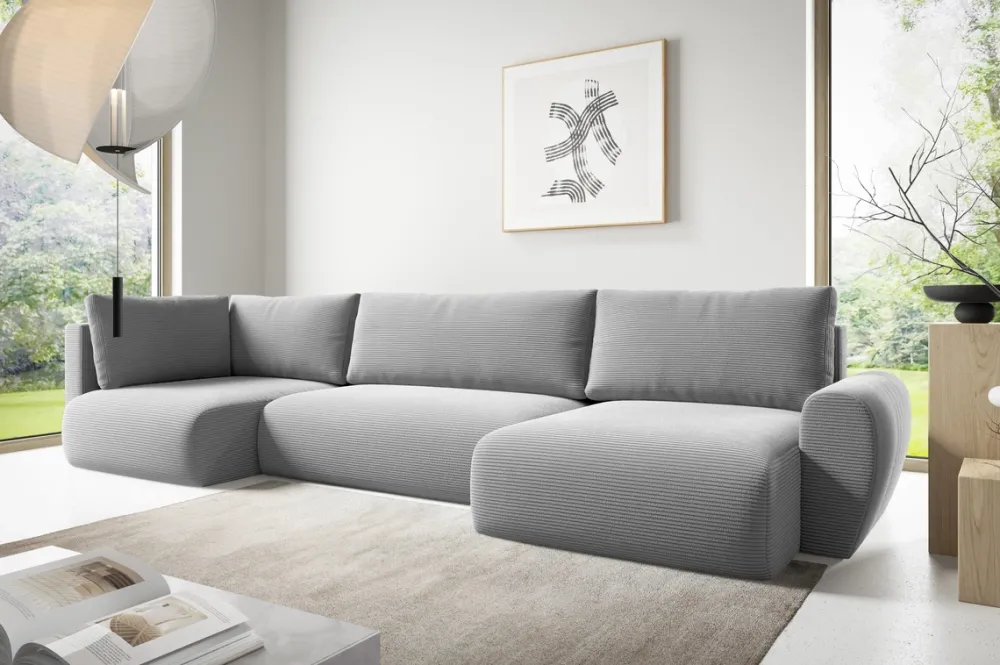Sztruksowy narożnik U PATI MAXI to idealne rozwiązanie dla osób ceniących sobie zarówno komfort, jak i nowoczesny design. Kształt U narożnika sprzyja wspólnym chwilą z bliskimi, umożliwiając użytkownikom swobodne konwersacje i wspólne spędzanie czasu, dzięki dużej ilości miejsca do siedzenia. Obłe kształty oraz zaokrąglone boczki dodają meblowi lekkości i nowoczesnego wyglądu, a jednocześnie sprawiają, że jest on bardziej przyjazny dla domowników, w tym dzieci.