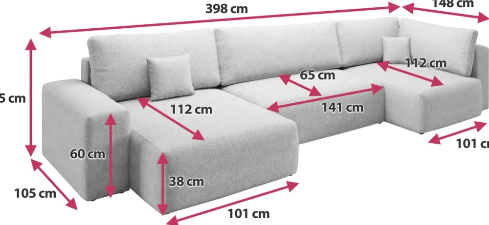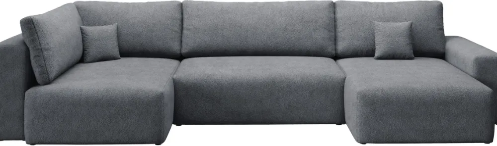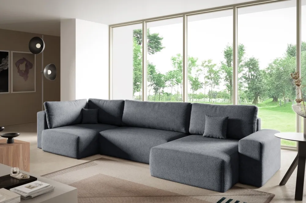 Rozkładany narożnik w kształcie U jest obity przyjemną w dotyku tkaniną typu baranek CENTAUR, która dodaje mu elegancji i współgra z różnymi aranżacjami wnętrz. Duży narożnik w kształcie U jest także bardzo praktyczny – wyposażono go w pojemnik na pościel, który pozwala na przechowywanie niezbędnych akcesoriów i tekstyliów do popołudniowych drzemek i okazjonalnych noclegów. Narożnik w kształcie U dzięki tyłowi obitemu tą samą tkaniną, co reszta mebla jest wolnostojący, co pozwala na swobodne ustawienie go w każdym miejscu salonu.