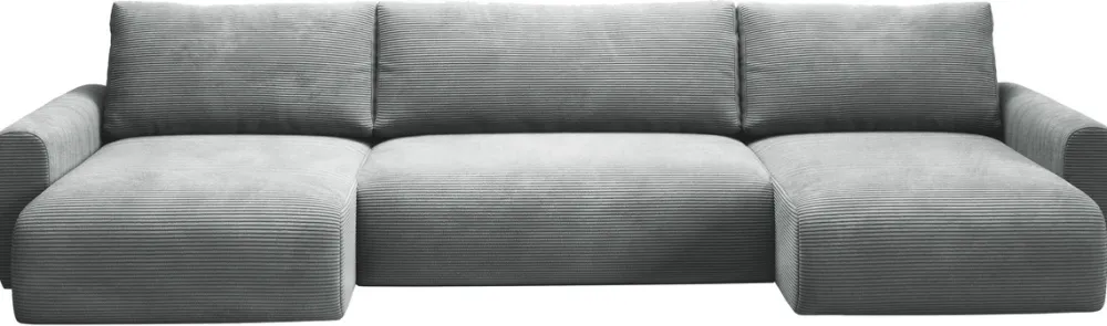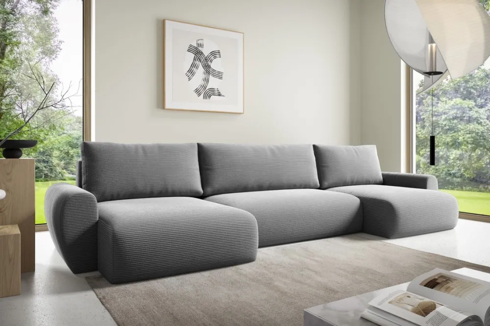 Rozkładany narożnik sztruksowy PATI U to wyjątkowo funkcjonalny i estetyczny mebel, który doskonale wpisze się w przestrzeń każdego nowoczesnego salonu. Jego charakterystyczny kształt U a co za tym idzie duża powierzchnia do siedzenia, gwarantują maksymalny komfort i swobodę podczas wspólnego spędzania czasu z rodziną czy przyjaciółmi. Nowoczesny narożnik do salonu wyposażony jest w funkcję spania o sporej powierzchni 344×133 cm, co pozwala na komfortowe przekształcenie salonu w dodatkową przestrzeń noclegową.