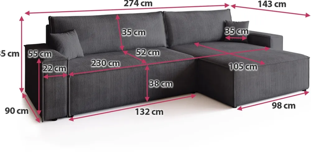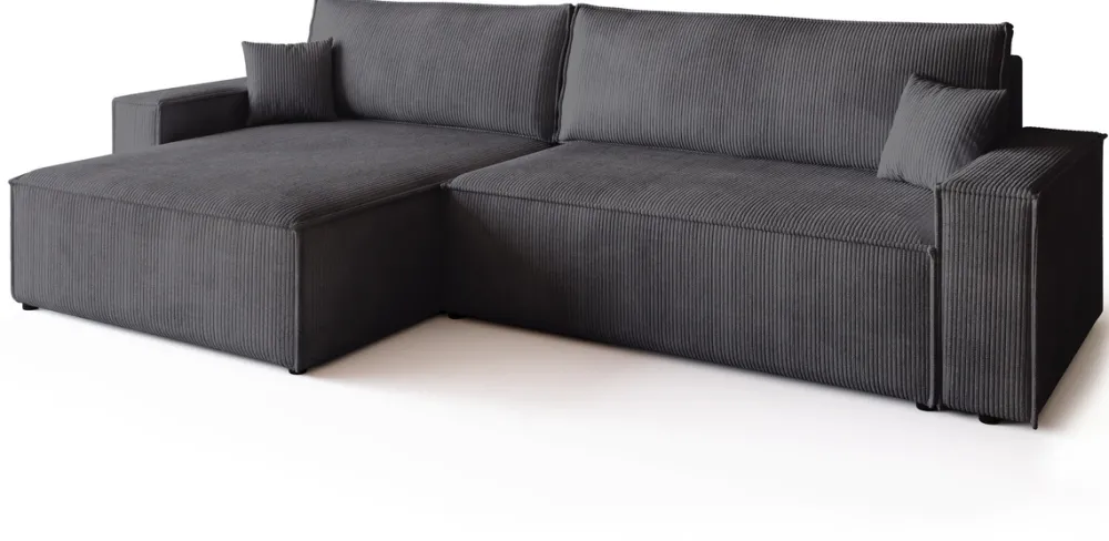Ten narożnik to doskonałe połączenie komfortu, praktyczności i nowoczesnego designu. Obszyty modną sztruksową tkaniną, wprowadza do wnętrza ciepło i przytulność, a jego funkcjonalność sprawia, że idealnie sprawdzi się zarówno na co dzień, jak i podczas wizyt gości. Duża powierzchnia spania, wygodne siedzisko i pojemnik na pościel to wszystko, czego potrzebujesz, by stworzyć komfortową przestrzeń relaksu.