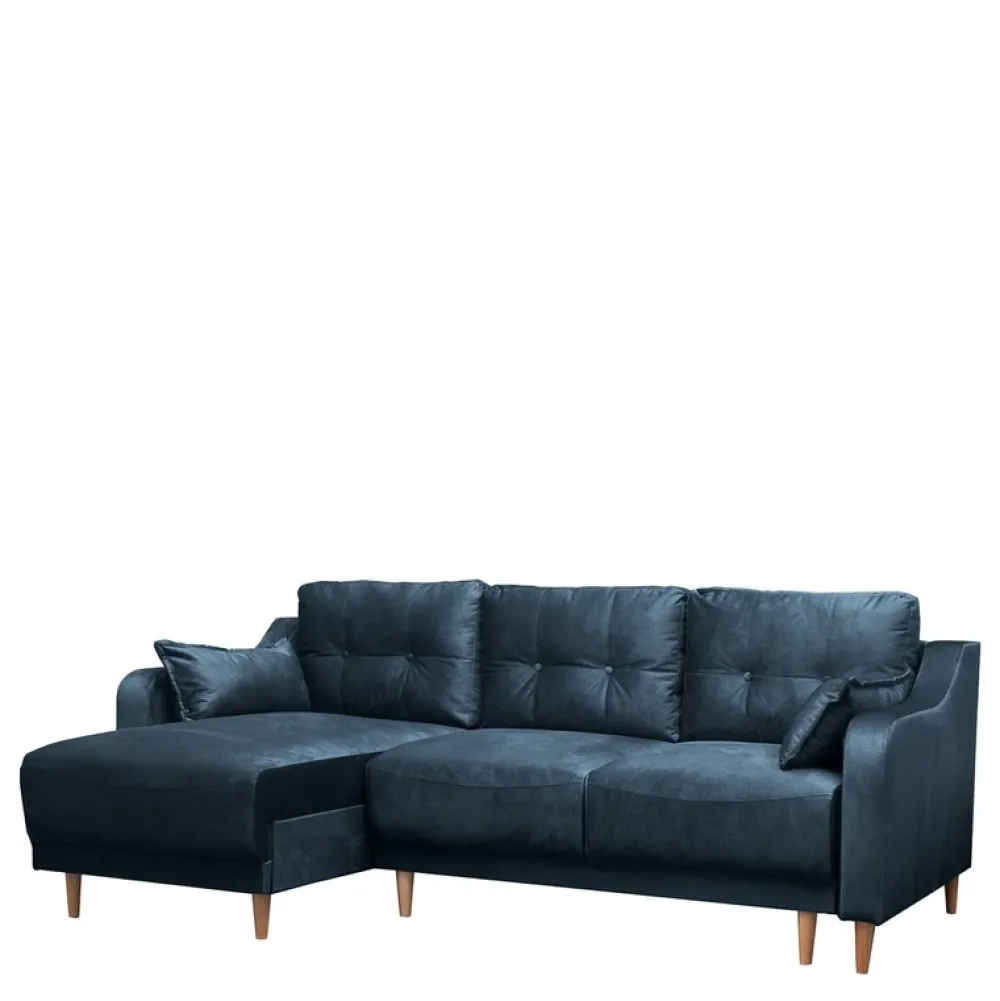 - Rozkładana kanapa rogowa DANILO została wyposażona w dwa głębokie pojemniki na pościele i poduszki. Dodatkowo rogówka posiada funkcję spania, która pozwala stworzyć miejsce do okazjonalnego snu. Wysokie nóżki wykonano z drewna.