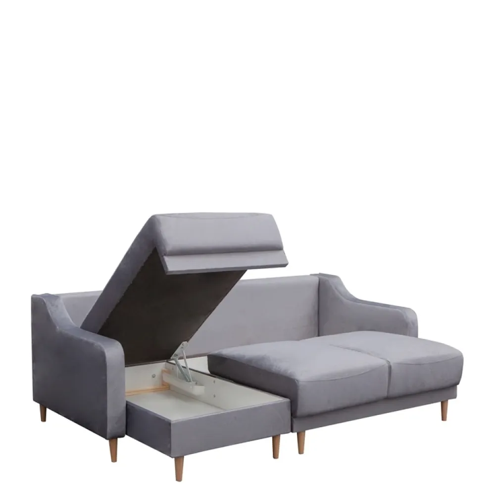 Nie trzeba już wybierać między stylowym wyglądem a użytecznością. Kanapa rogowa z pojemnikiem DANILO oferuje funkcję spania, co sprawia, że jest idealna nie tylko do codziennego relaksu, ale również jako dodatkowe miejsce do spania dla gości. Po rozłożeniu zyskujesz komfortowe i przestronne łóżko, z którego nie będziesz chciał się podnieść.