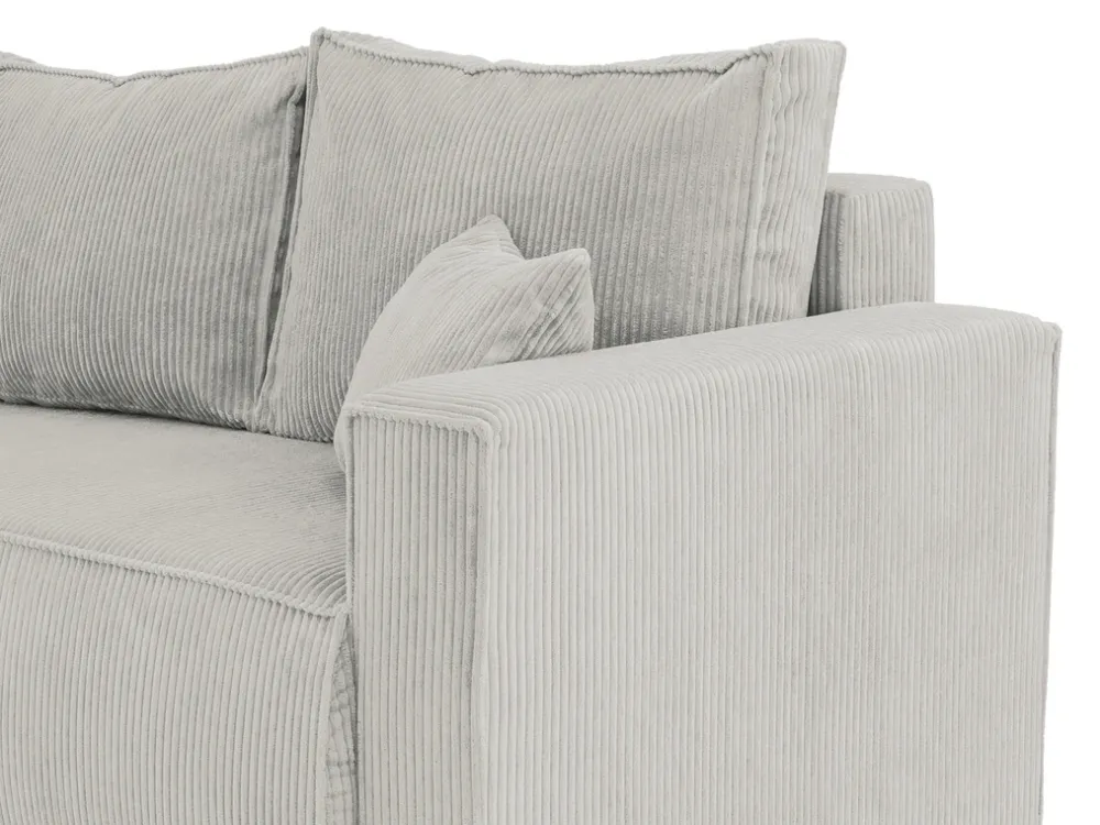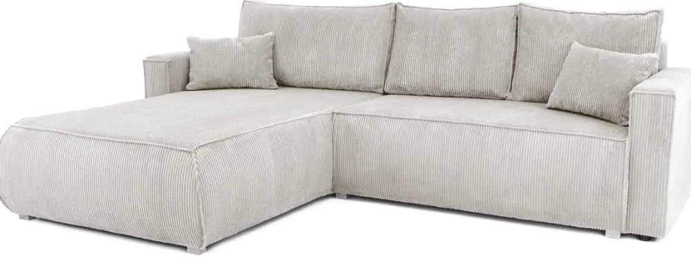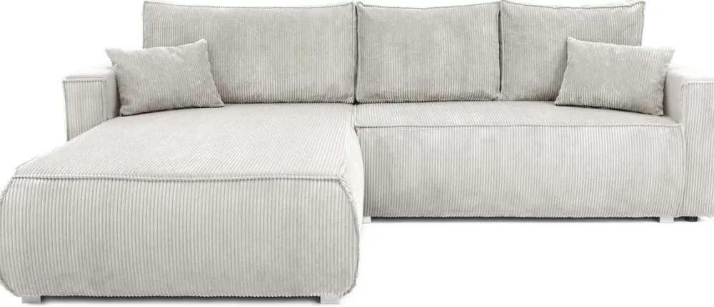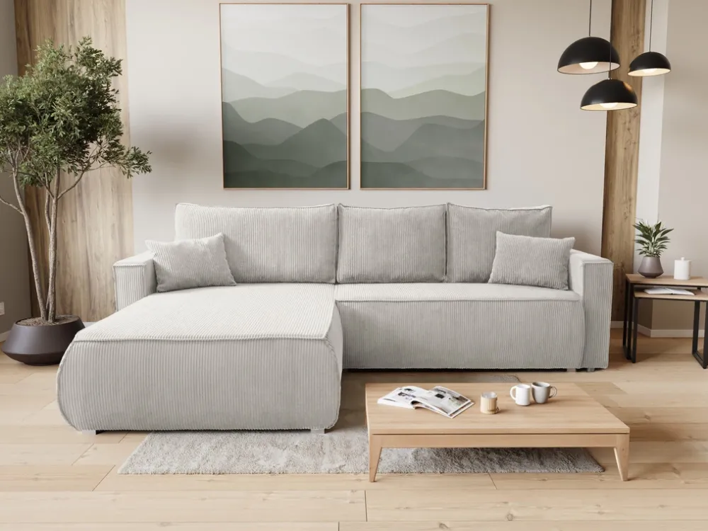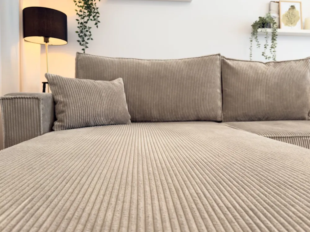 Obicie z miękkiego sztruksu nadaje narożnikowi wyjątkowy charakter, a jego neutralny odcień pasuje do różnych aranżacji wnętrz. Tapicerowany tył sprawia, że mebel prezentuje się świetnie niezależnie od ustawienia – zarówno pod ścianą, jak i w centralnej części pokoju.