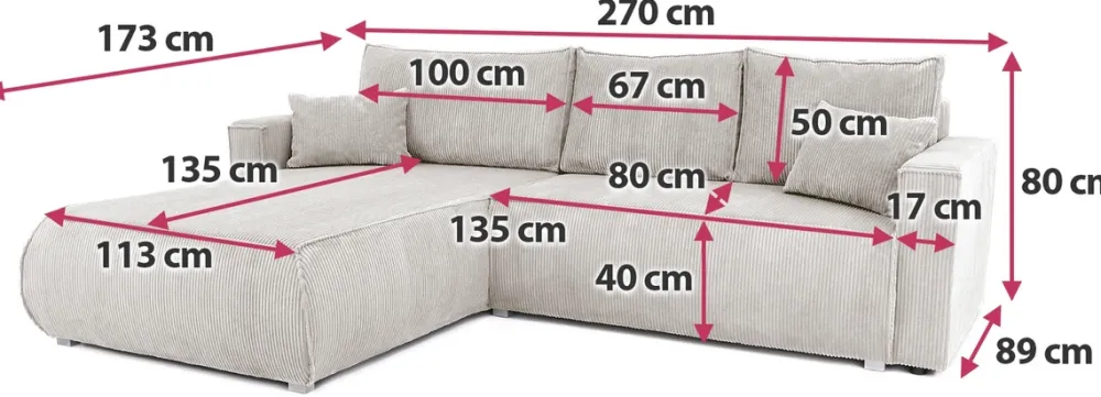 Dzięki funkcji spania o wymiarach 120×236 cm narożnik z łatwością zamienia się w wygodne łóżko. To doskonałe rozwiązanie zarówno dla gości, jak i na co dzień. Wbudowany pojemnik na pościel pozwala na przechowywanie koców i poduszek, pomagając utrzymać porządek w salonie.