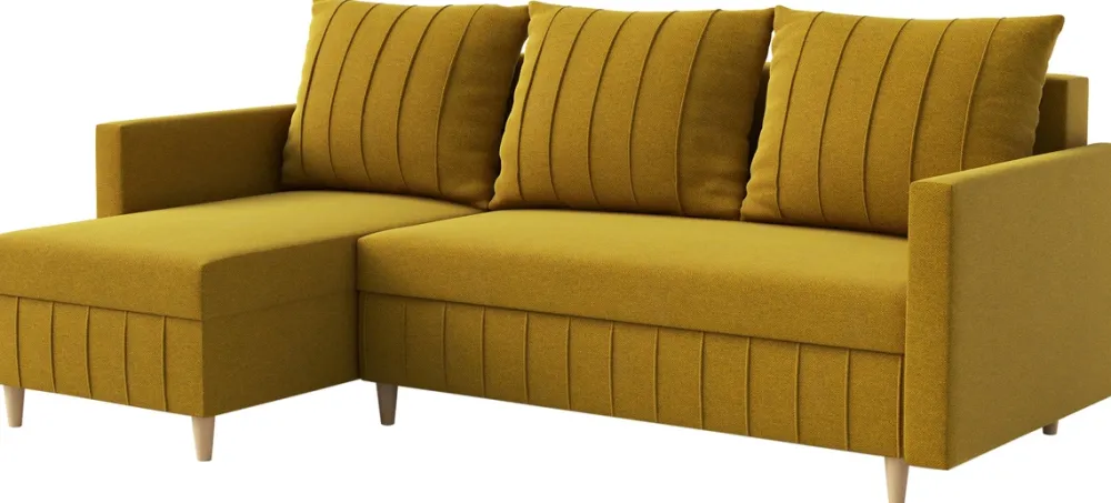 Montaż narożnika jest intuicyjny i szybki, dzięki czemu oszczędzasz czas i energię. Trzy duże poduchy zadbają o odpowiednie podparcie dla pleców podczas odpoczynku. Natomiast wysokie drewniane nóżki nie tylko stabilizują mebel, ale także podkreślają jego nowoczesny design oraz ułatwiają sprzątanie pod nim.