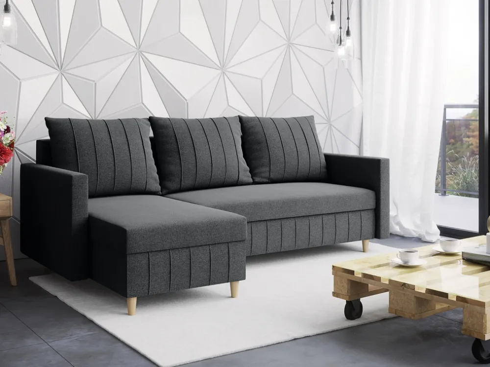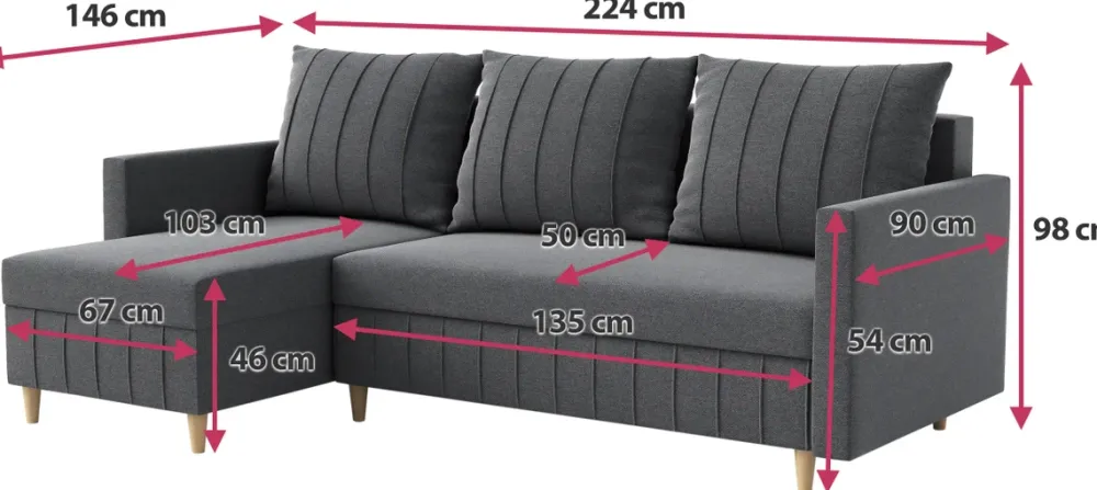 Montaż narożnika jest intuicyjny i szybki, dzięki czemu oszczędzasz czas i energię. Trzy duże poduchy zadbają o odpowiednie podparcie dla pleców podczas odpoczynku. Natomiast wysokie drewniane nóżki nie tylko stabilizują mebel, ale także podkreślają jego nowoczesny design oraz ułatwiają sprzątanie pod nim.