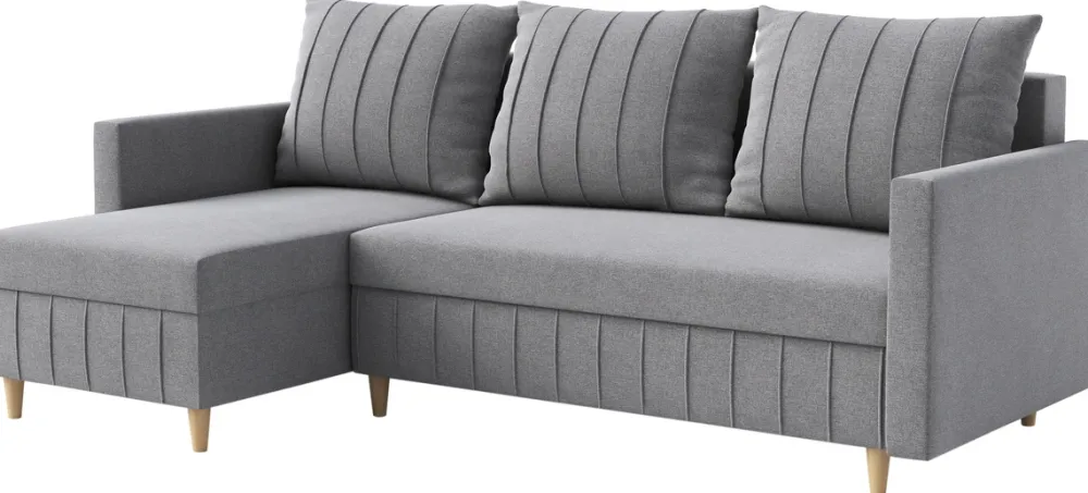 Montaż narożnika jest intuicyjny i szybki, dzięki czemu oszczędzasz czas i energię. Trzy duże poduchy zadbają o odpowiednie podparcie dla pleców podczas odpoczynku. Natomiast wysokie drewniane nóżki nie tylko stabilizują mebel, ale także podkreślają jego nowoczesny design oraz ułatwiają sprzątanie pod nim.