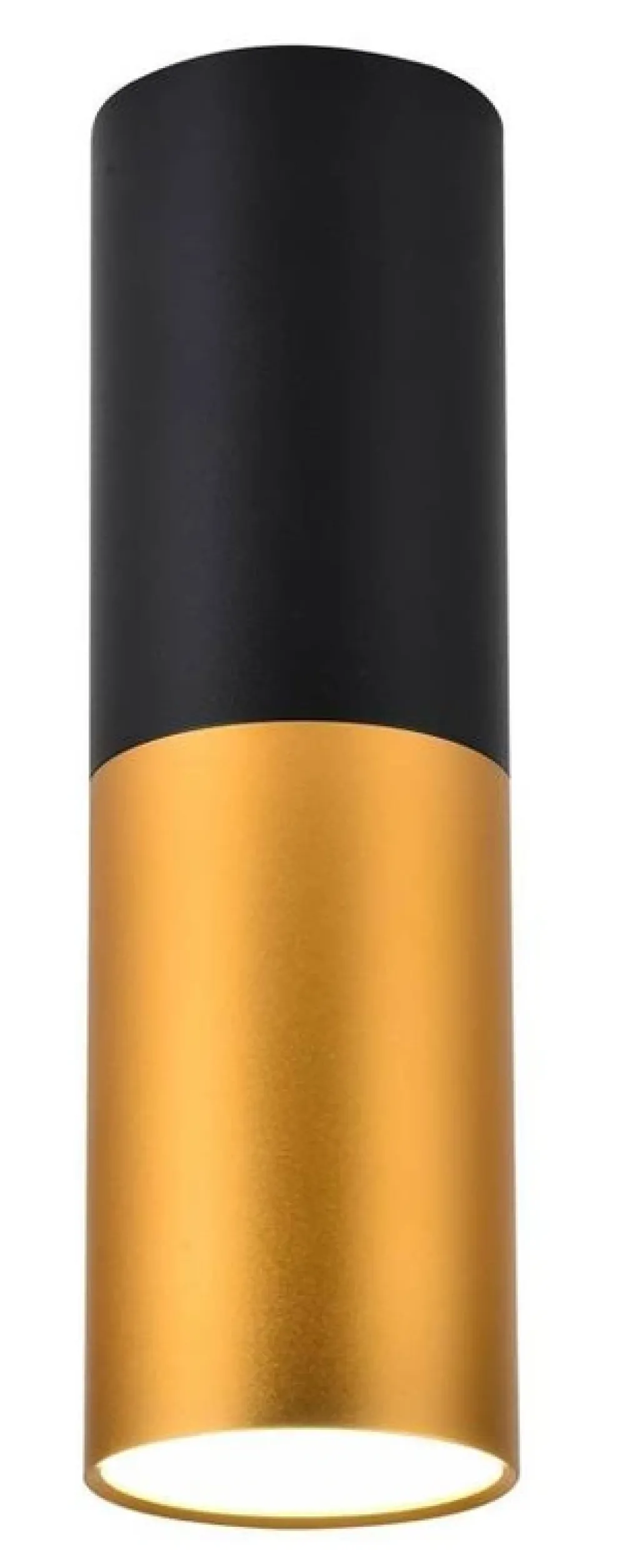Minimalistyczna sufitowa lampa wisząca w kształcie walca. Wyposażona w trzonek GU10 do wymiennych źródeł światła. Wykonana z aluminium, malowana dwukolorowo co zwiększa możliwość dopasowania do kolorystki wnętrz. Oprawa sufitowa czarno-złota 15W GU10 Tuba doskonale prezentuje się pojedynczo oraz jako oświetlenie grupowe.