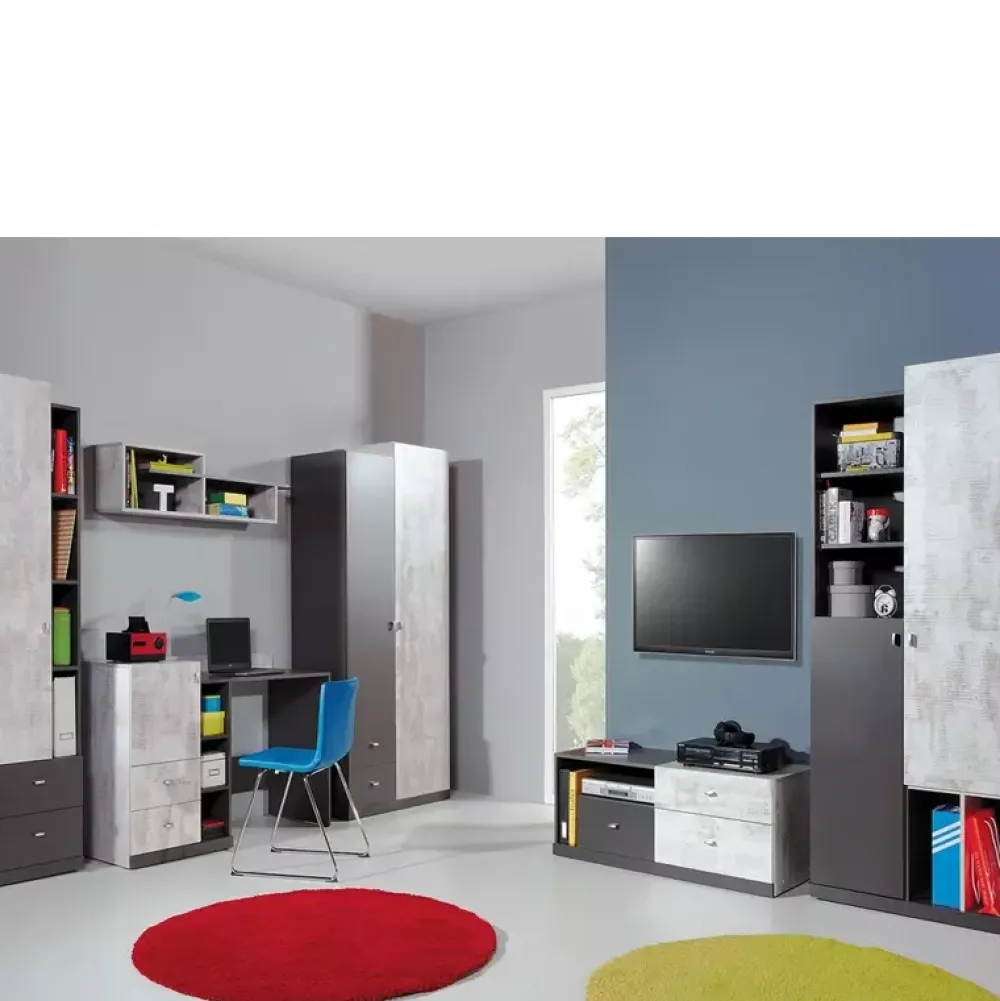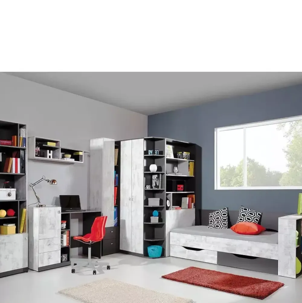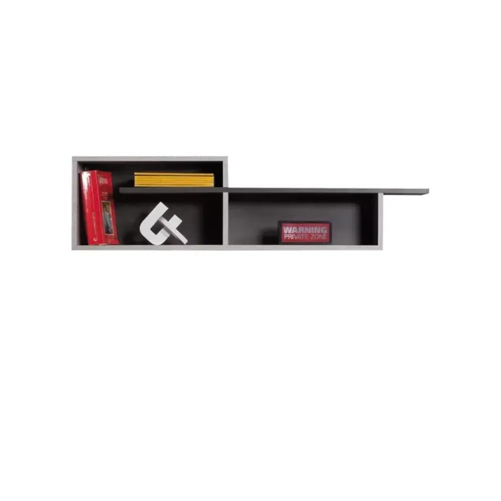 - Półka do pokoju młodzieżowego o szerokości 115 cm, skłąda się z dwóch segmentów połączonych półką asymetrycznie przechodzącą przez całą konstrukcję, delikatnie wystając po jednej stronie.