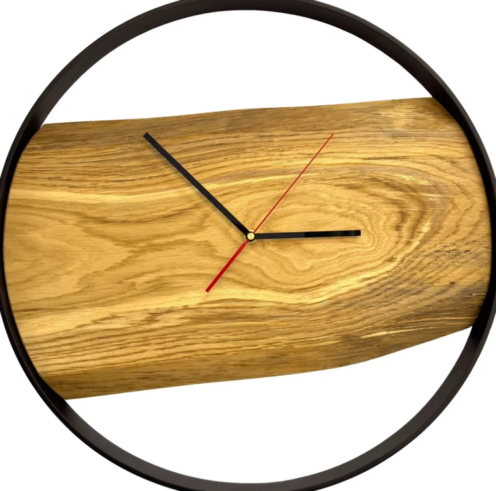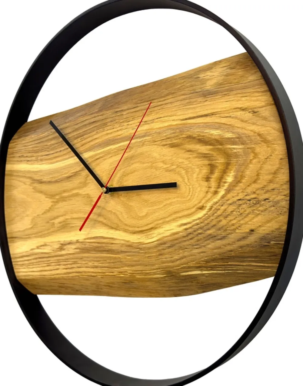 - Zegar ścienny RAW wykonany został z solidnego sezonowanego drewna dębowego, zabezpieczonego naturalnym olejem. Zegar w stylu loftowym posiada ramę wykonaną z metalu. Mechanizm zegara zasila 1 bateria AA.