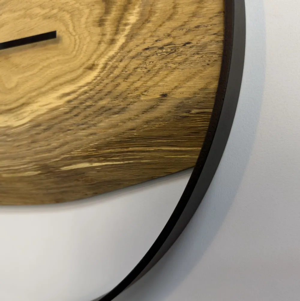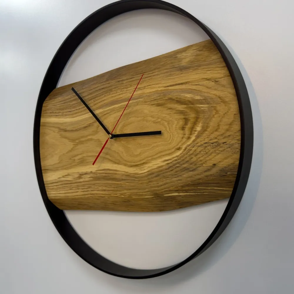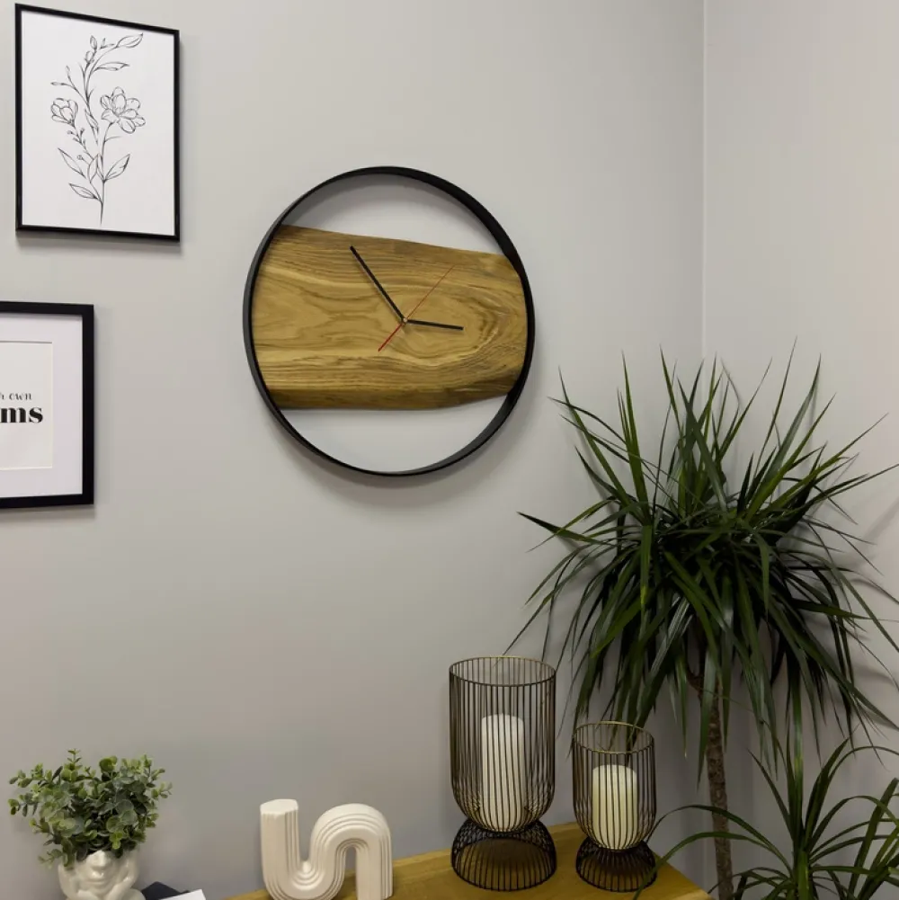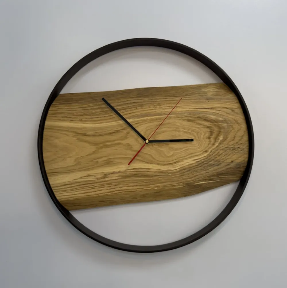 Zegar ścienny RAW charakteryzuje się wyjątkową kombinacją klasyki i stylu. Jego rama, wykonana z metalu malowanego na głęboki czarny kolor, doskonale kontrastuje z naturalnym pięknem tarczy z drewna dębowego. Drewno to zostało sezonowane przez 3 lata, co zapewnia trwałość i stabilność materiału. Po obróbce powierzchnia dębu została zabezpieczona naturalnym olejem Osmo, który tworzy mikroporowatą warstwę ochronną. Ta specjalistyczna powłoka nie tylko zabezpiecza drewno przed ścieraniem, wodą i brudem, ale również podkreśla jego naturalną teksturę i barwę, dodając zegarowi wyjątkowego charakteru.