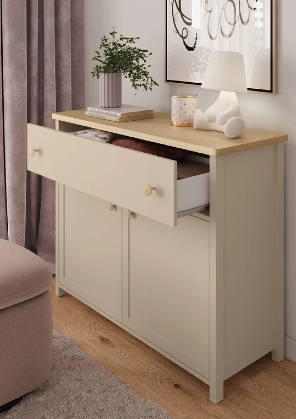 - Kolorystyka – beż piaskowy z akcentem dąb vincenza bielona, pasująca do kolekcji STORY