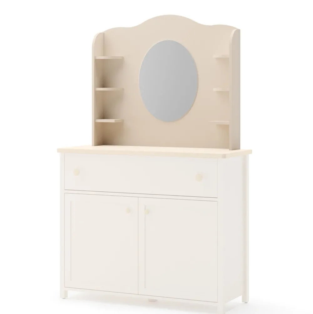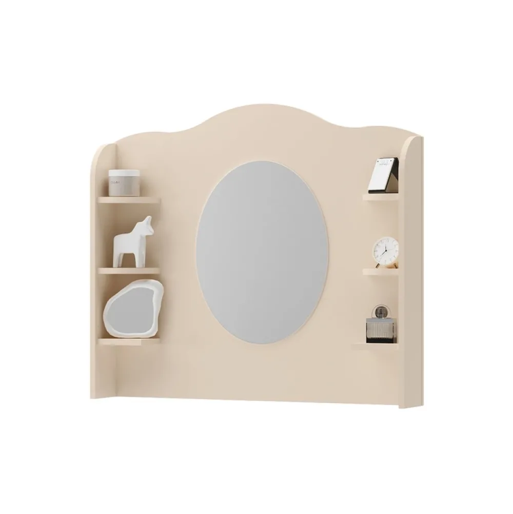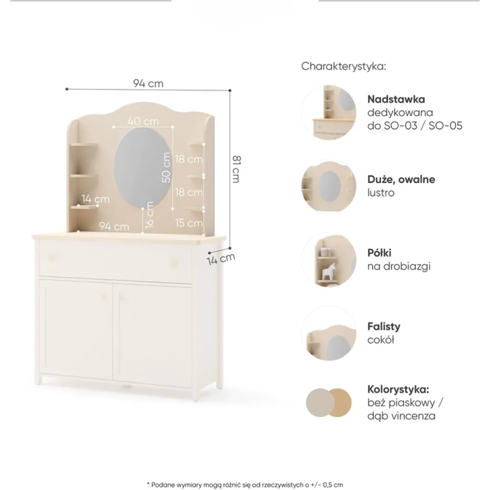 - Nadstawka STORY z owalnym lustrem i sześcioma półkami. Wykonana z laminowanej płyty, obrzeża ABS. Kolor beż piaskowy z akcentem dębu vincenza bielonego. Montaż na komodzie lub biurku. Praktyczne rozwiązanie do stworzenia funkcjonalnej toaletki.