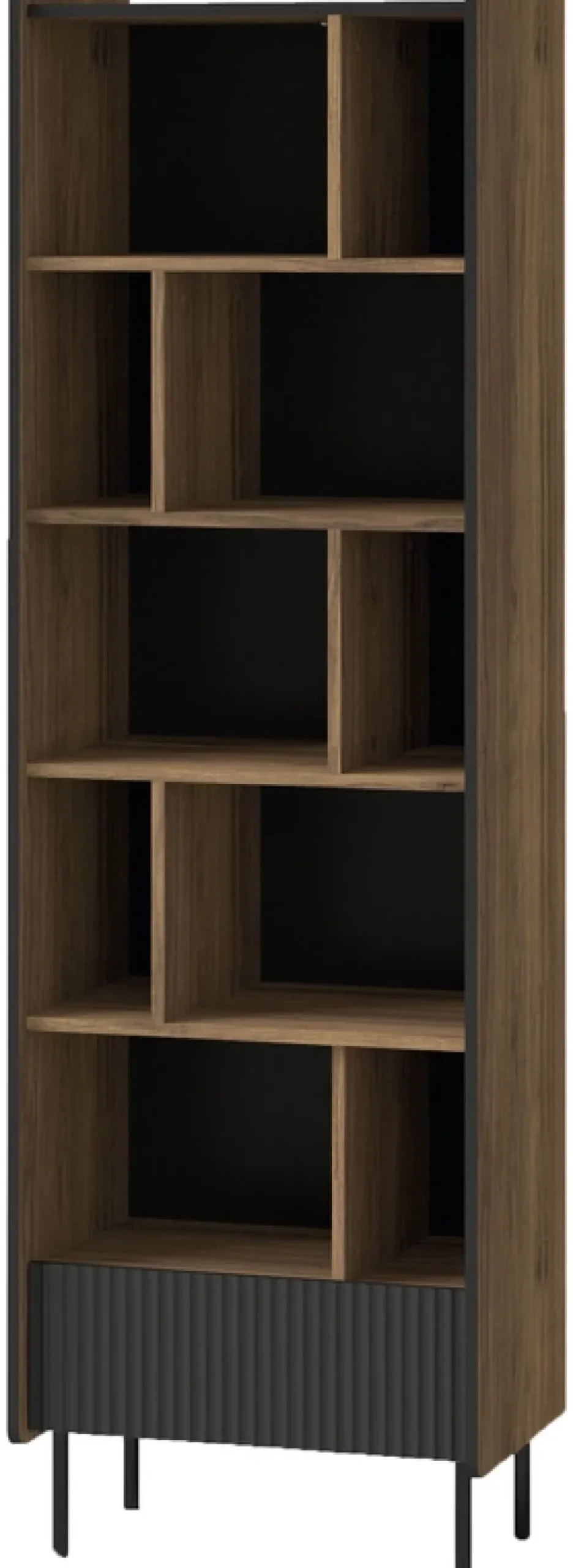 - Regał otwarty PINNACLE o szerokości 59 cm, wyposażony w jedną szufladę . Korpus i półki wykonane z płyty laminowanej w wybarwieniu orzech warmia, natomiast front szuflady z ryflowanej płyty MDF o kolorze czarnym. Obrzeża wzmocnione okleiną PCV.