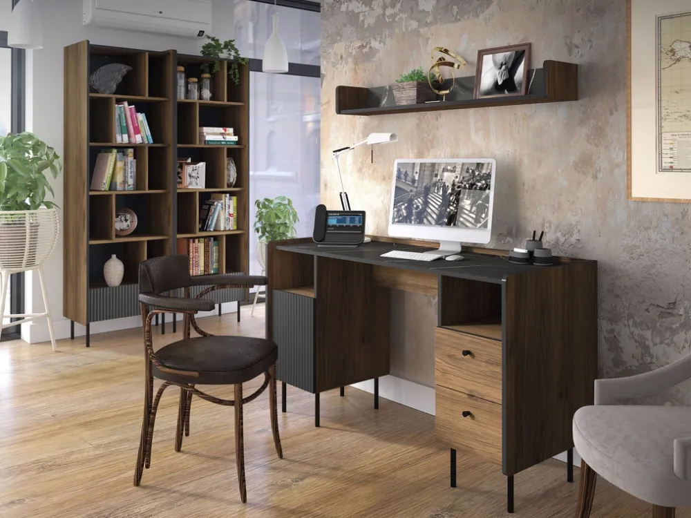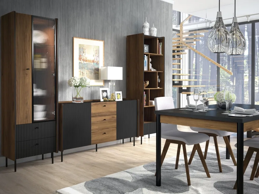 Estetyczny wygląd mebla podkreśla starannie dobrana kolorystyka. Korpus regału w odcieniu orzecha warmia dodaje wnętrzu ciepła i naturalnego charakteru, tworząc przytulną atmosferę. Kontrastujący z nim front szuflady, wykonany z płyty MDF w głębokim kolorze czarnym, wprowadza nowoczesny akcent, podkreślając elegancję i wyrafinowanie całej konstrukcji.