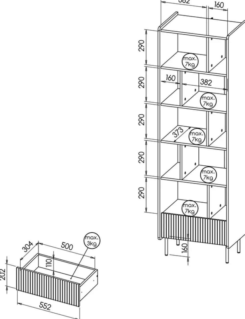 Regał ten łączy w sobie nie tylko piękno, ale i funkcjonalność. Otwarta konstrukcja z mnóstwem przestrzeni na półkach umożliwia łatwy dostęp do przechowywanych przedmiotów i eksponowanie dekoracji, tworząc przy tym otwartą i przestronną atmosferę w pomieszczeniu. Dodatkową zaletą jest praktyczna szuflada, która pozwala na ukrycie mniej estetycznych, ale niezbędnych przedmiotów. Ryflowany front szuflady nie tylko jest stylowym detalem, ale również zapewnia lepszy chwyt, łącząc w sobie walory estetyczne z użytkowymi.