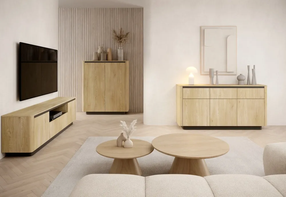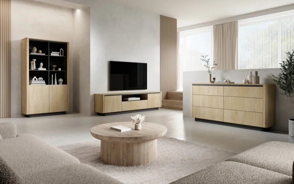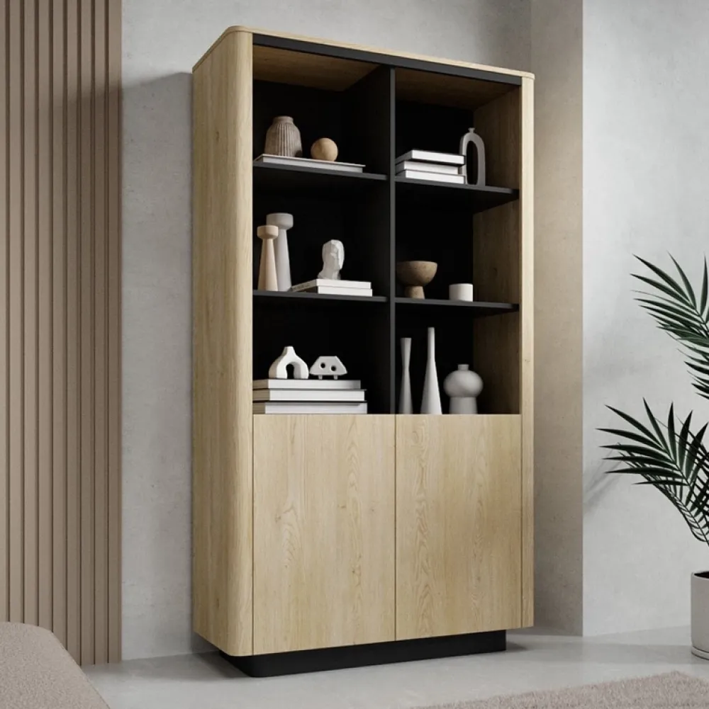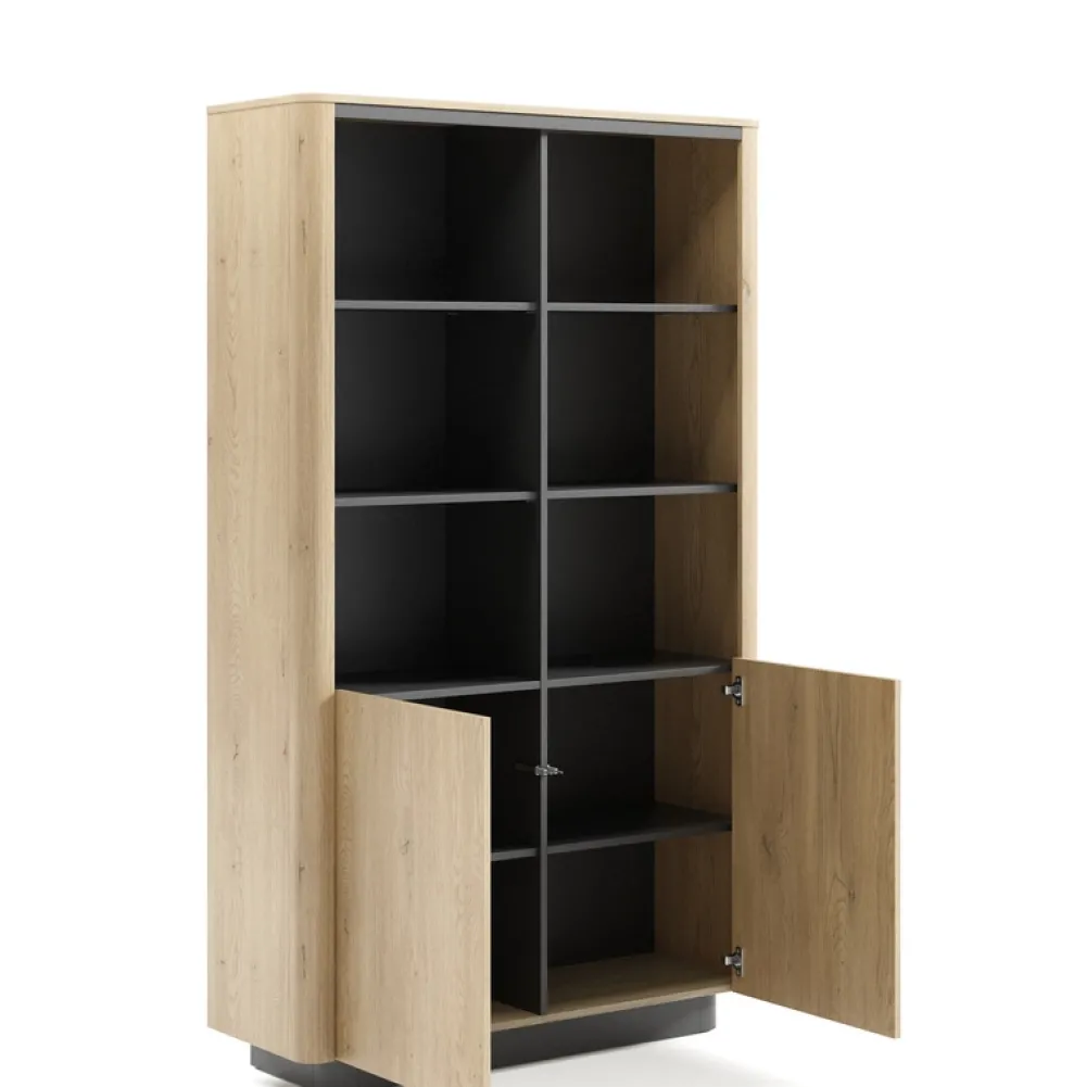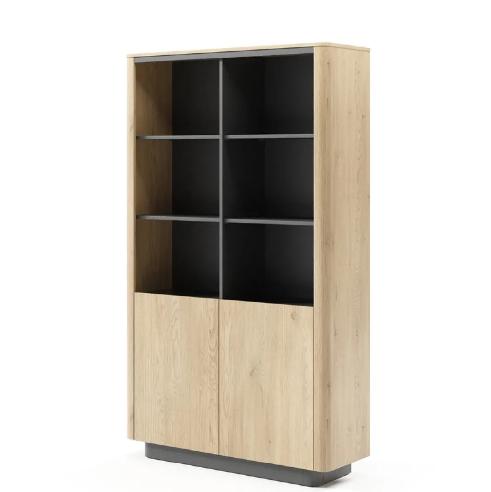 Regał zamykany to stylowe i funkcjonalne rozwiązanie do salonu, gabinetu czy pokoju młodzieżowego. Połączenie ciepłego dekoru dąb cremona z elegancką czernią tworzy nowoczesny efekt wizualny, a system push-to-open zapewnia wygodę użytkowania. Przemyślana konstrukcja łączy estetykę z praktycznym przechowywaniem, oferując zarówno otwarte półki, jak i zamkniętą dolną przestrzeń.