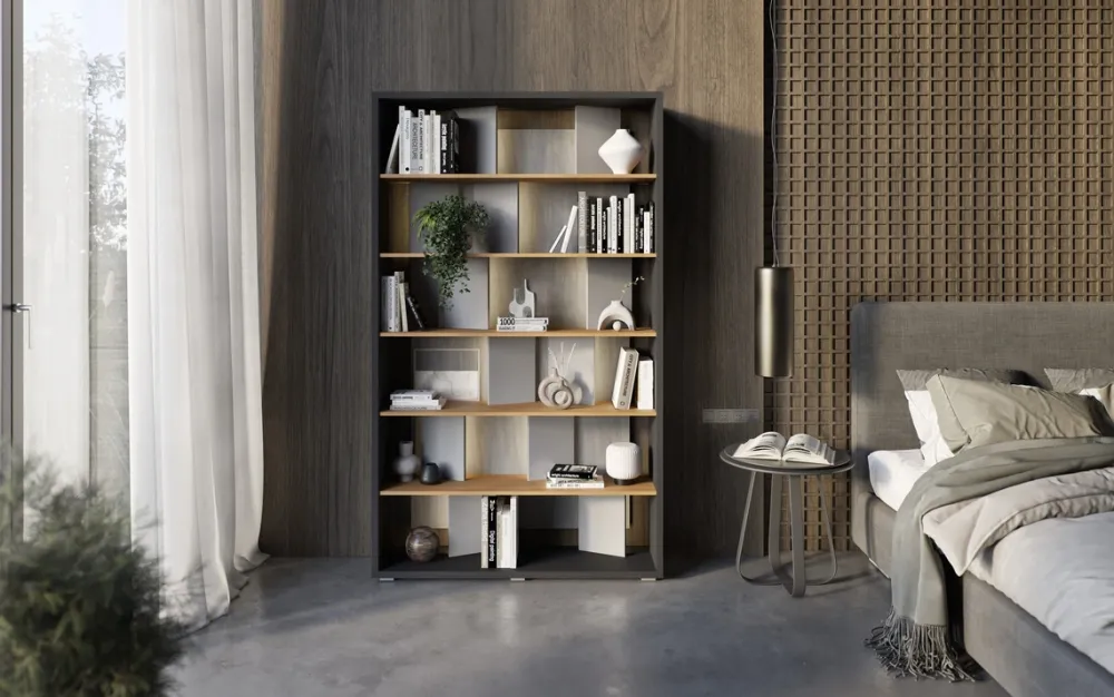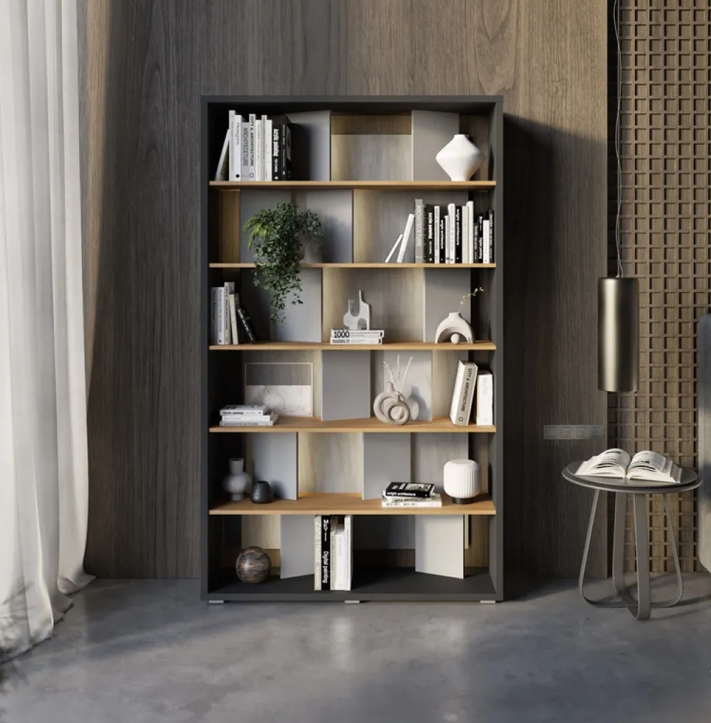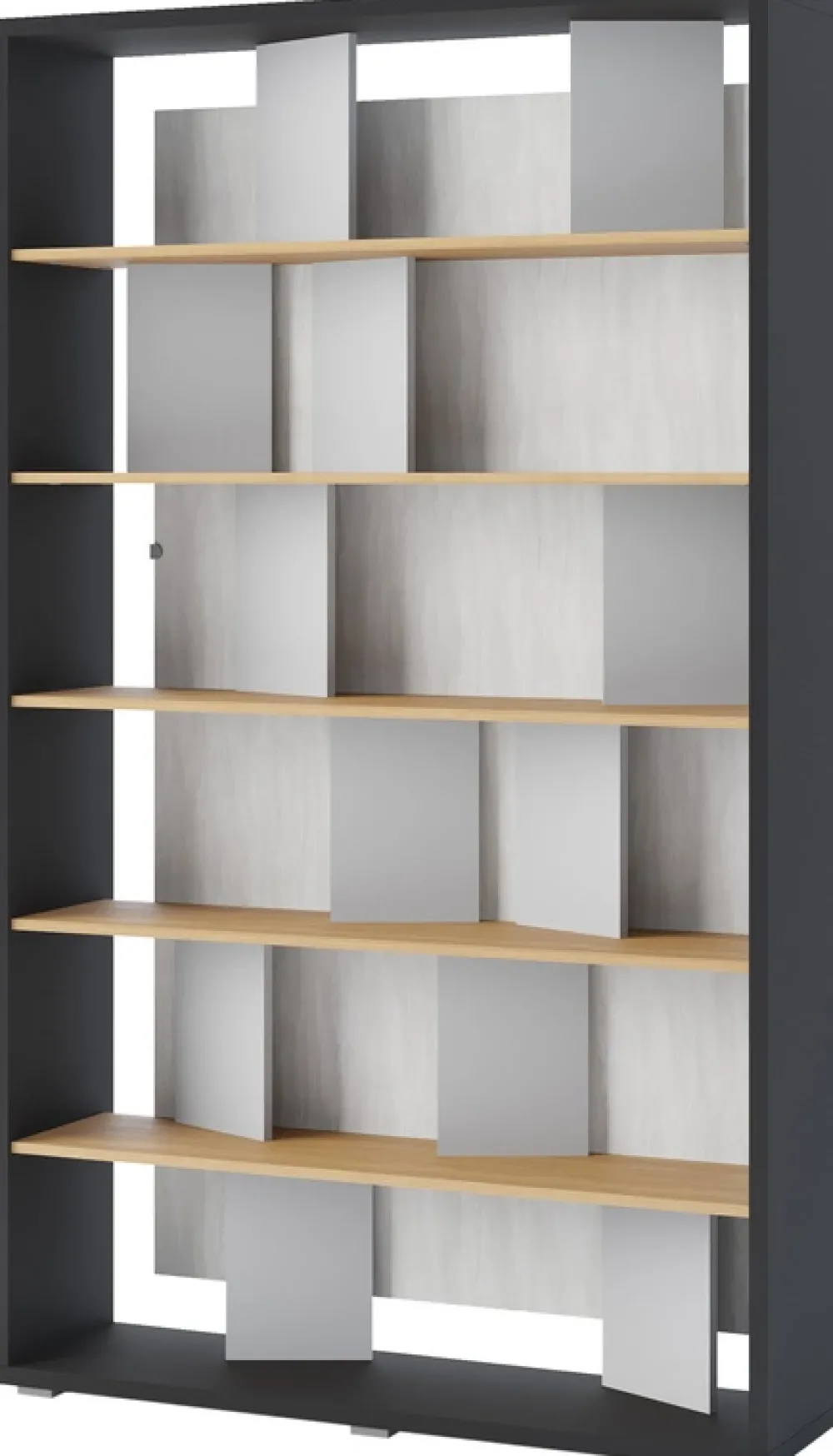 Jednym z najbardziej charakterystycznych elementów tego regału są jego półki z przegródkami ustawionymi pod skosem. To innowacyjne rozwiązanie dodaje meblowi dynamicznego i nowoczesnego wyglądu, a jednocześnie pozwala na nietypowe i kreatywne rozmieszczenie przechowywanych przedmiotów. Przegródki pod skosem nie tylko podkreślają wyjątkowy design regału, ale także ułatwiają organizację przestrzeni, tworząc wizualnie estetyczną kompozycję.
