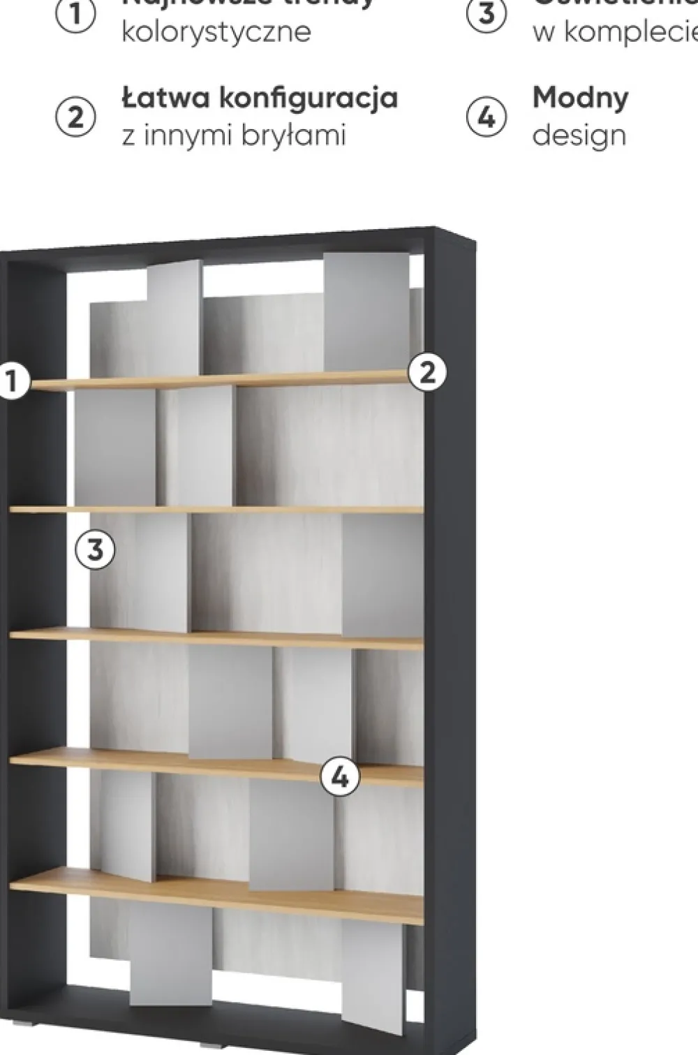 - Regał w komplecie posiada energooszczędne oświetlenie LED. Pozwala ono na podświetlenie półek mebla.