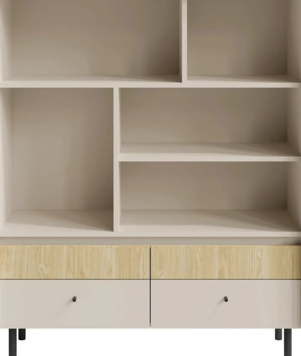 Regał z szufladami MALIVO to połączenie praktycznego przechowywania z designerską formą, która doskonale wpisuje się w nowoczesne i minimalistyczne wnętrza. Otwarte półki w asymetrycznym układzie pozwalają na efektowną ekspozycję dekoracji, a cztery pojemne szuflady – z frontami w kolorze dębu olejowanego – gwarantują porządek i funkcjonalność. Wszystko utrzymane w ciepłej kolorystyce beżu piaskowego z eleganckimi czarnymi detalami.