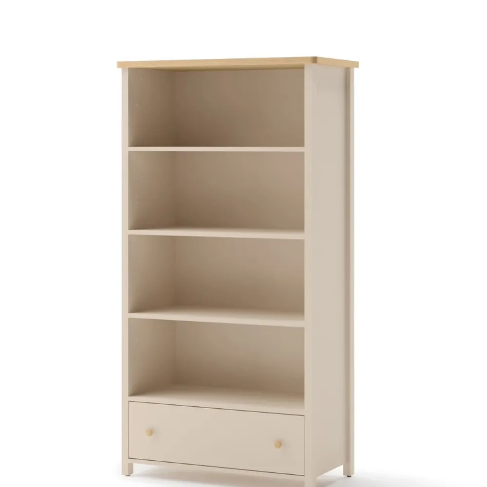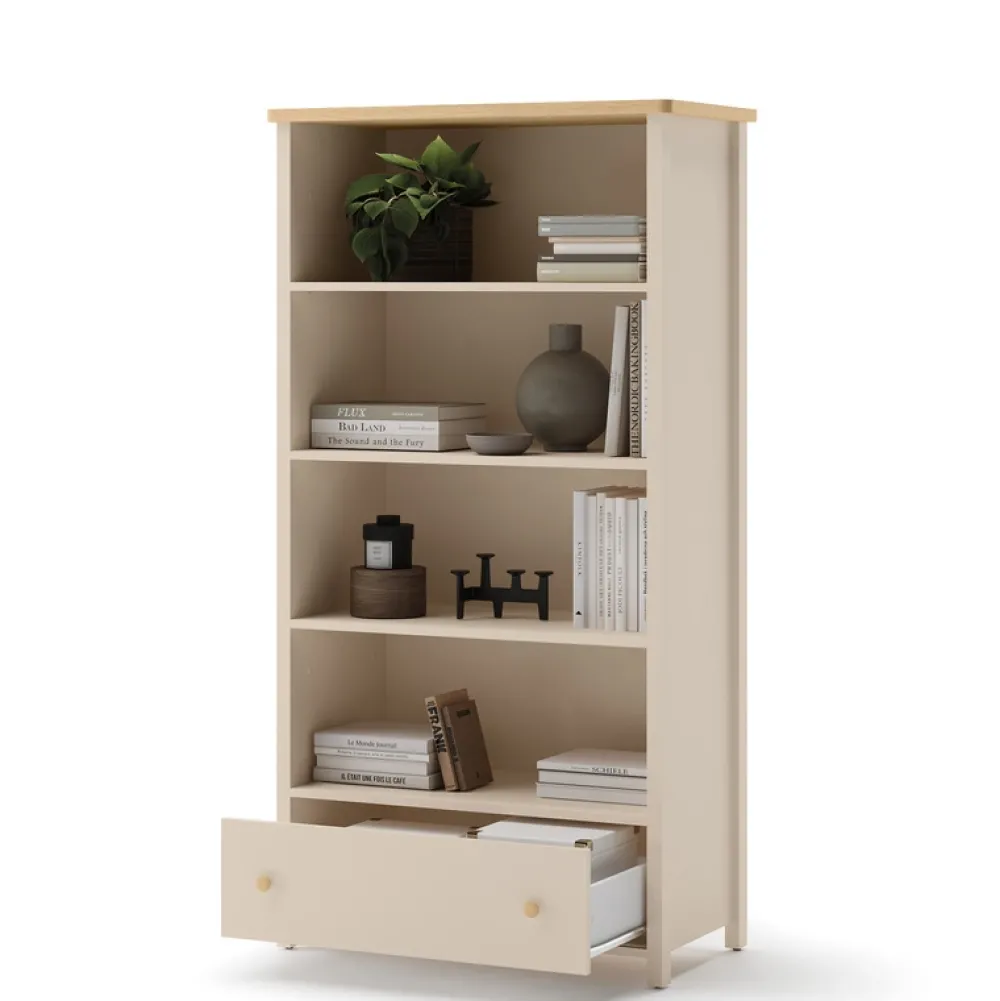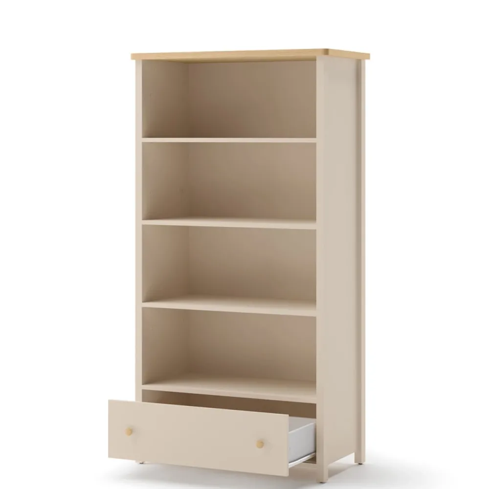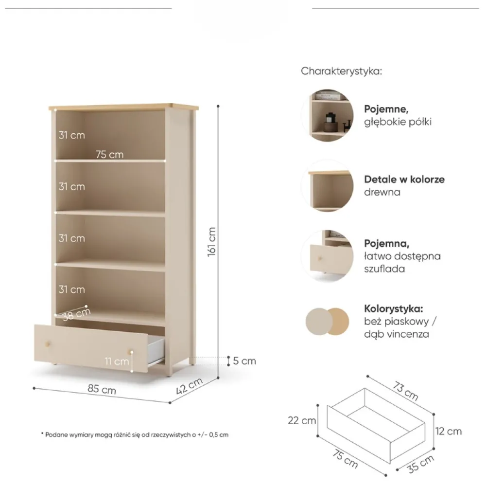 Regał biblioteczka STORY to funkcjonalny mebel, który doskonale sprawdzi się jako miejsce na książki, dokumenty czy dekoracje. Wyposażony w cztery głębokie półki i łatwodostępną szufladę, pozwala na estetyczne przechowywanie i utrzymanie porządku. Beżowa kolorystyka w połączeniu z blatem w dekorze dąb vincenza bielona dodaje wnętrzu przytulnego charakteru i harmonii.