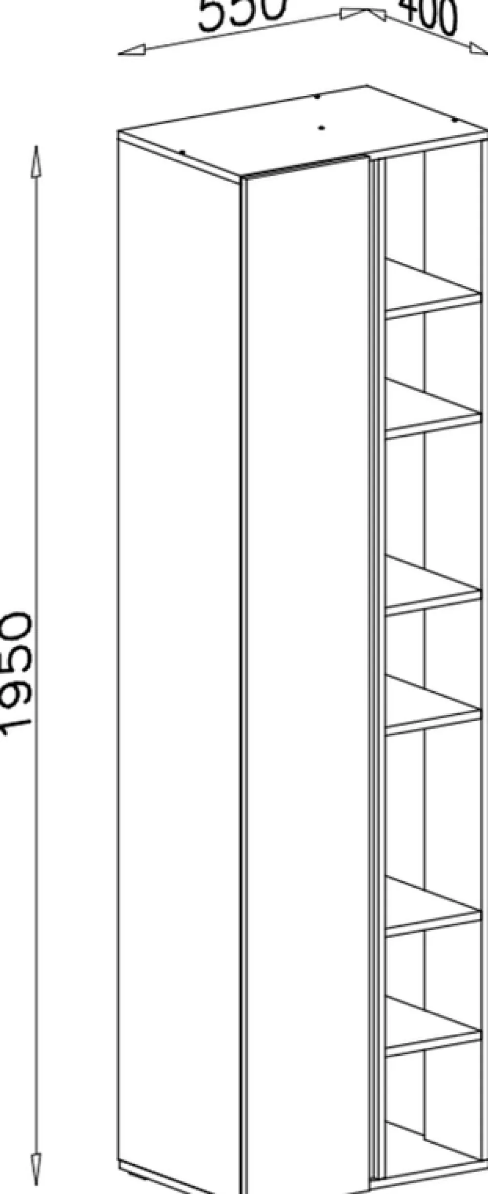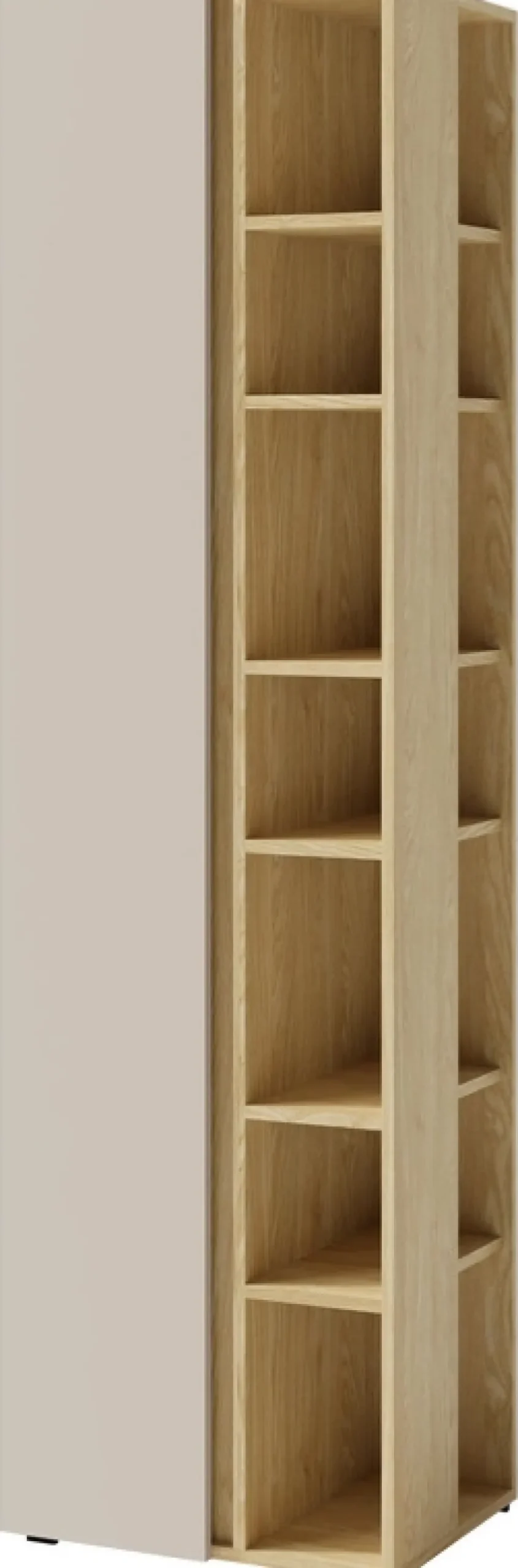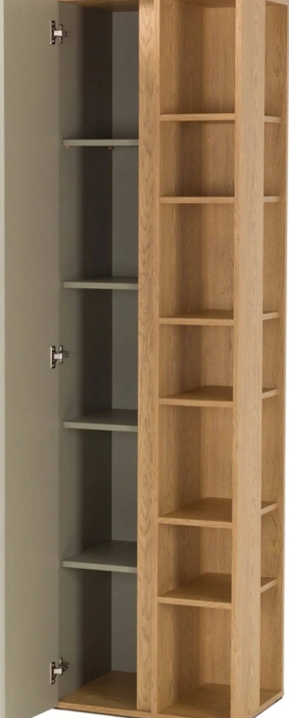 Wysoki regał LISSARO o szerokości 55 cm to kompaktowe rozwiązanie, które doskonale sprawdzi się nawet w niewielkich wnętrzach. Po lewej stronie znajdziesz zamykane drzwi, za którymi kryją się półki, idealne do przechowywania ubrań, książek czy innych drobiazgów, które chcesz ukryć przed wzrokiem. Z kolei po prawej stronie otwarte półki pozwalają na wyeksponowanie ulubionych dekoracji, akcesoriów czy pamiątek, nadając wnętrzu osobisty charakter.