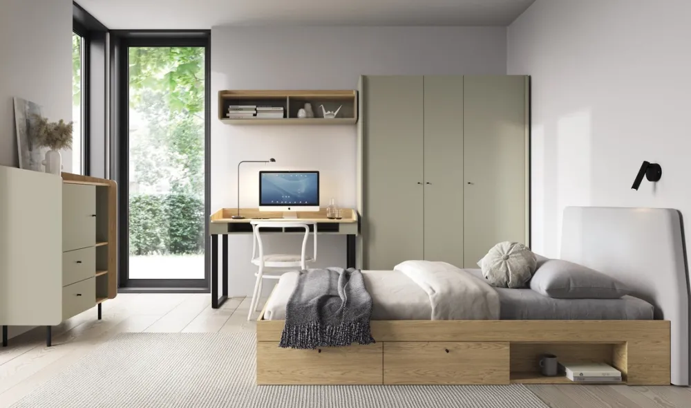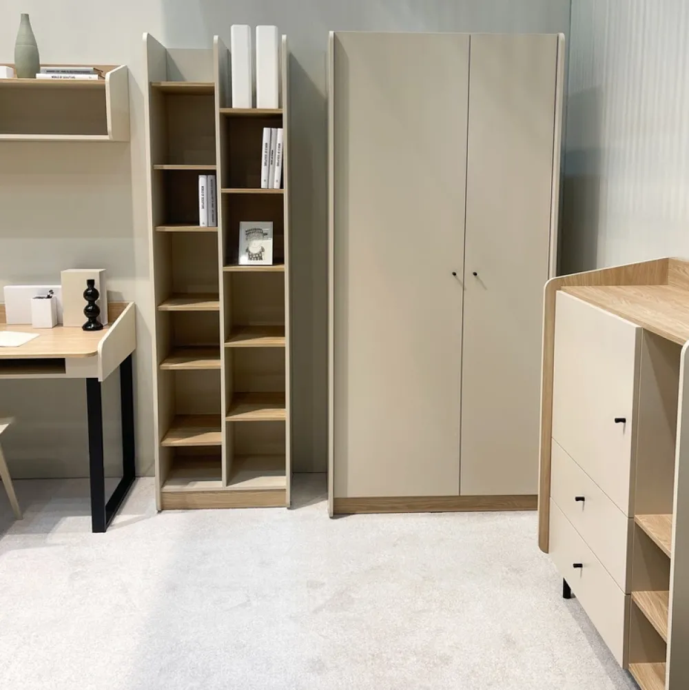 Dostępny w dwóch modnych kolorach – beż piaskowy oraz eukaliptus – pozwala dopasować go do indywidualnych preferencji i stylu pokoju nastolatka. Obrzeża wykonane z trwałej okleiny ABS zapewniają odporność na uszkodzenia, co czyni regał idealnym rozwiązaniem do codziennego użytku.