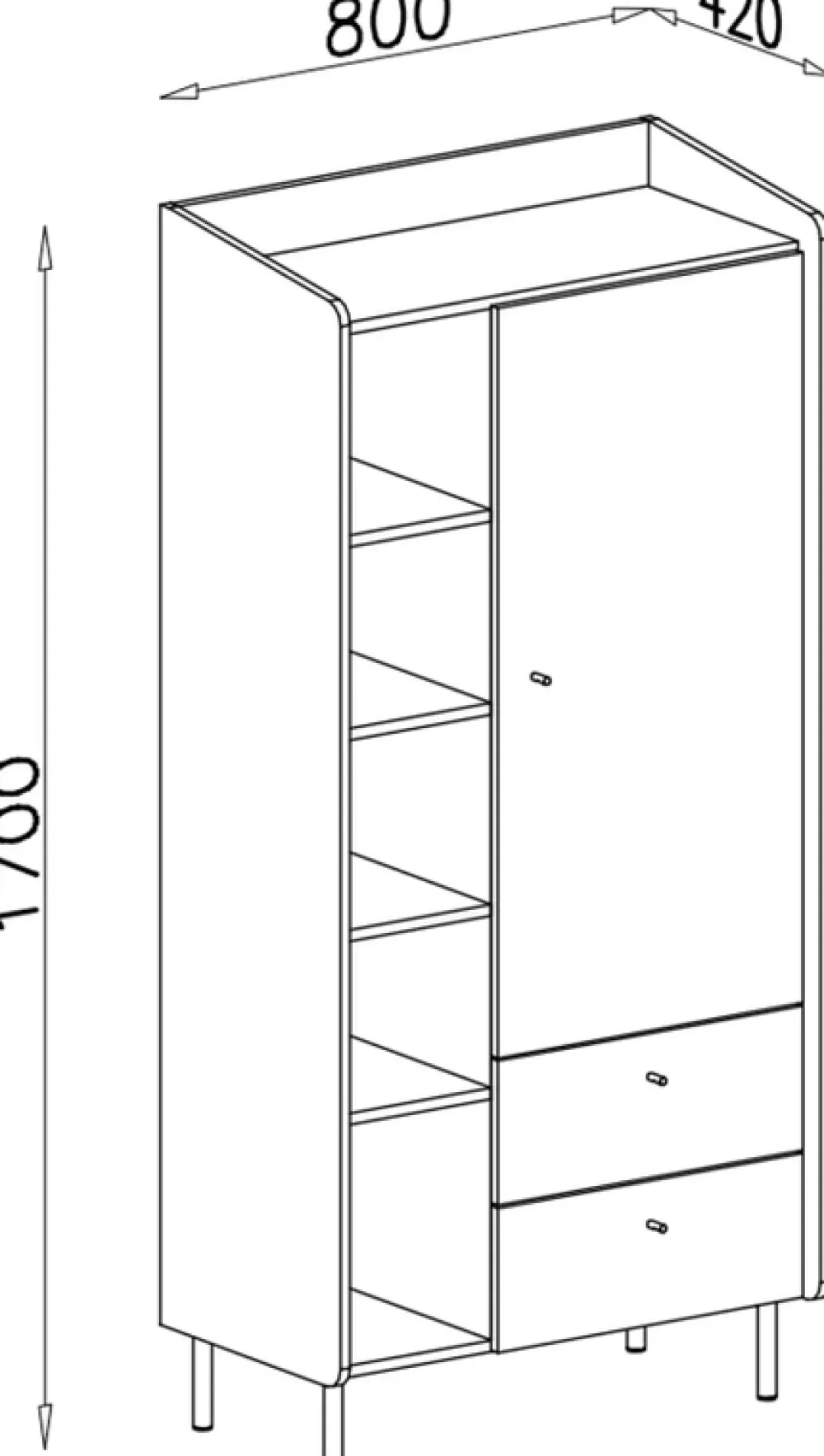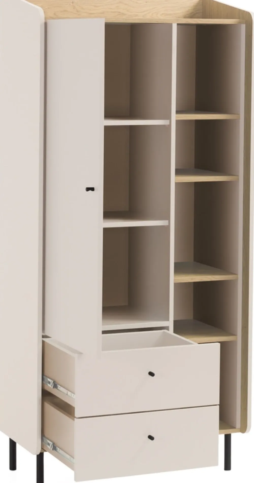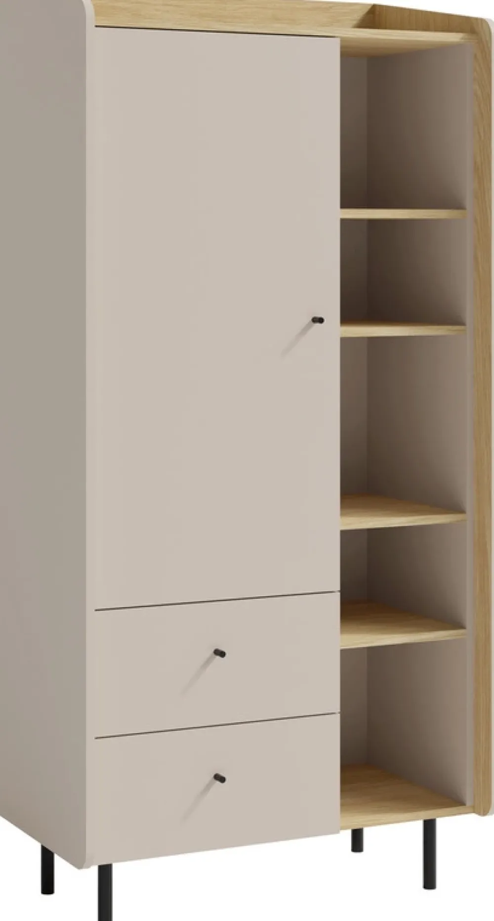 Dzięki wysokim nóżkom mebel zyskuje lekki, nowoczesny wygląd, a dodatkowo ułatwia codzienne sprzątanie, zapewniając dostęp do przestrzeni pod spodem. U dołu regał posiada dwie szuflady, idealne do przechowywania drobnych przedmiotów, które chcesz mieć pod ręką, ale ukryte przed wzrokiem gości. Z prawej strony znajdują się drzwi, za którymi kryją się trzy pojemne półki – świetne miejsce na przechowanie rzeczy, które wymagają dyskretnego schowania.