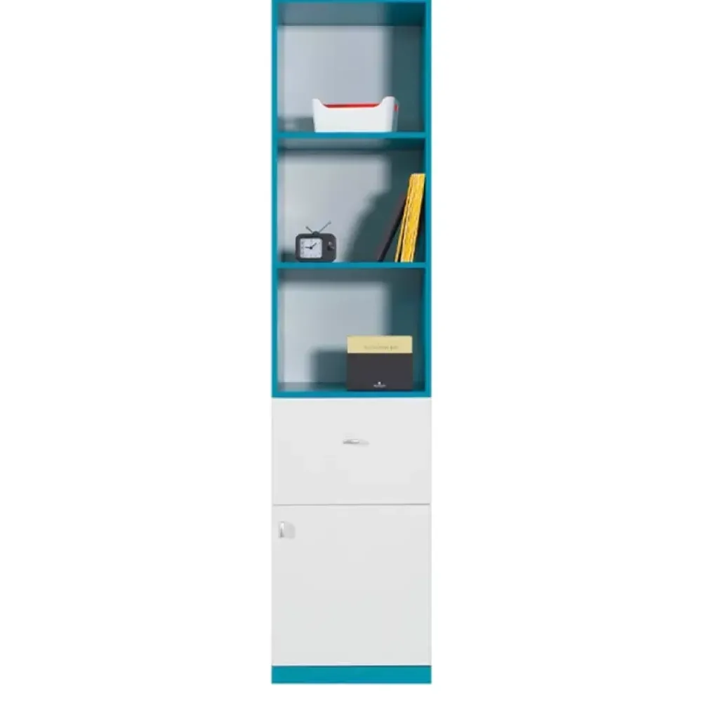 Regał z kolekcji MALVES to miejsce na którym możesz umieścić swoje książki, akcesoria oraz dekory, którymi nadasz pomieszczeniu własnych, niepowtarzalnych akcentów. Dodatkowo regał został wyposażony w szafkę oraz szufladę, przez co zyskasz dodatkowe miejsce, na swoje akcesoria. Regał dzięki swojej stylistyce świetnie sprawdza się w pokojach młodzieżowych.