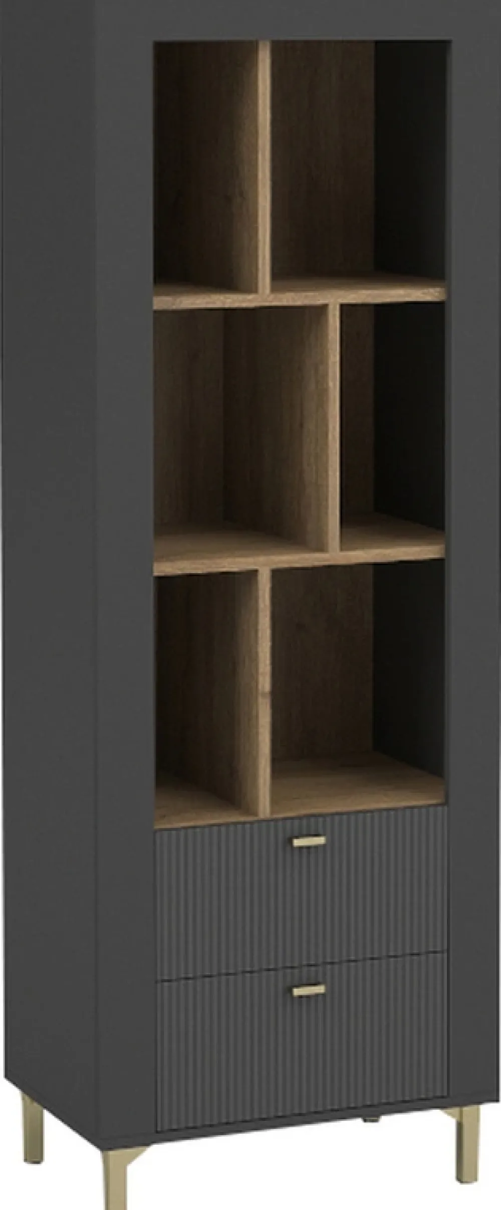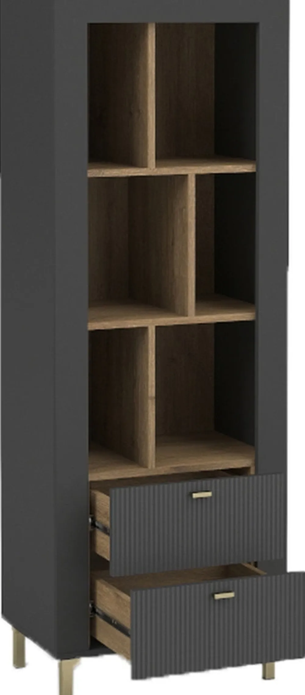 - Regał do salonu 60 cm MISTY posiada liczne otwarte półki, które doskonale sprawdzą się do rozmieszczenia książek i innych akcesoriów. Dodatkowo regał został wyposażony we dwie szuflady na akcesoria, które wyróżniają się prążkowanymi frontami.