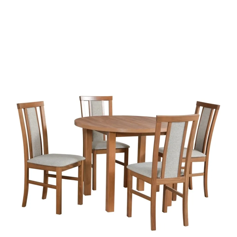Zestaw dopełniają cztery solidne drewniane krzesła, które stanowią połączenie trwałości i komfortu. Siedziska i oparcia krzeseł są miękko tapicerowane, co gwarantuje wygodę nawet podczas dłuższych biesiad. Każdy detal, od nóg po wykończenie oparcia, został starannie zaprojektowany.
