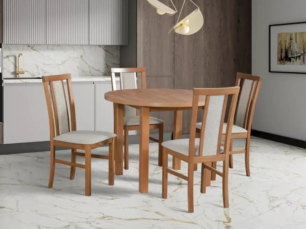 Ale to nie wszystko! Aby dostosować się do Twojego indywidualnego gustu, oferujemy wiele wybarwień drewna – od jasnego dębu po głęboki mahoniowy odcień. A jeśli chodzi o tkaniny na krzesła, możesz wybierać spośród bogatej palety kolorów, które z pewnością podkreślą charakter Twojego wnętrza.