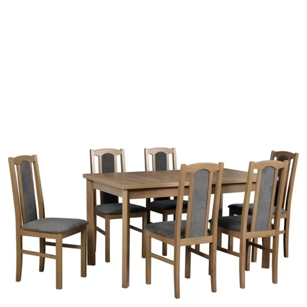 Stół z krzesłami z kolekcji NESTO to zestaw który świetnie pasuje do klasycznych i stonowanych aranżacji jadalni. Funkcja rozkładania, która znalazła miejsce w stole pozwoli ci zwiększyć długość jego blatu podczas wizyty gości, a krzesła z tapicerowanym siedziskiem i oparciem zapewnią wszystkim domownikom komfort podczas siedzenia. Zestaw jest dostępny w wielu wariantach wybarwień drewna, co pozwoli ci dopasować zarówno stół, jak i krzesła do aranżacji pomieszczenia. Do wykonania stołu i krzeseł, wykorzystano naturalne okleiny oraz drewno bukowe, dzięki czemu możemy ukazać naturalne piękno i strukturę materiału. W związku z wykorzystaniem naturalnych materiałów w stołach mogą występować naturalne różnice, takie jak usłojenie czy różnice odcieni drewna, będące cechami potwierdzającymi naturalne pochodzenie materiału.