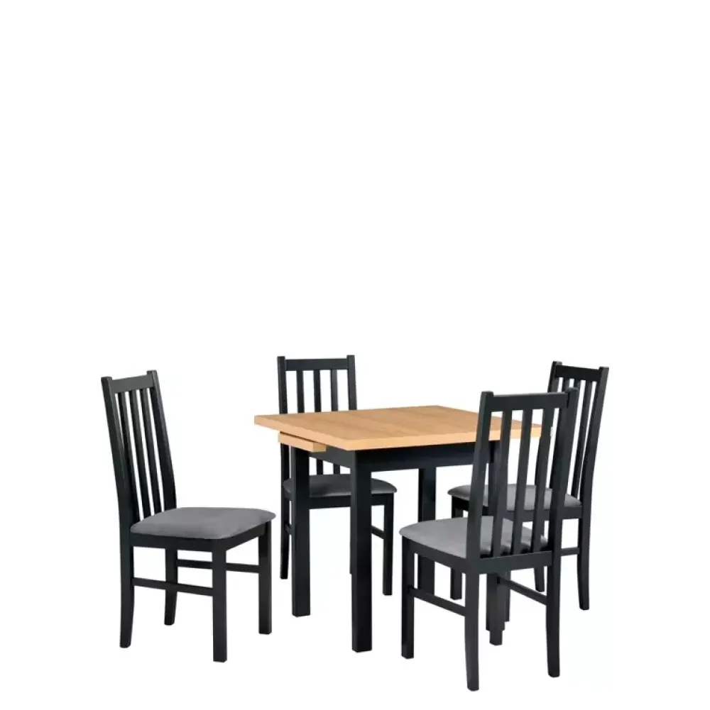 - Zestaw do jadalni z kolekcji MOTTA sprawdzi się we współczesnych aranżacjach jadalni. Zestaw składa się ze stołu posiadającego funkcję rozkładania oraz czterech krzeseł wyposażonych w tapicerowane siedzisko i oparcie w formie szczebelków.