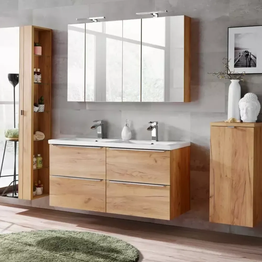 Białe szafki łazienkowe na wysoki połysk wzbogacone wstawkami w kolorze dąb craft złoty, pomogą zaaranżować łazienkę w stylu nowoczesnym. Przytulne, rustykalne wnętrze w łazience uzyskasz z pomocą szafek łazienkowych w drewnopodobnym dekorze dąb craft złoty, a czarne, matowe fronty będą zwieńczeniem łazienki loftowej. Kolekcja Charm zawiera 9 szafek wiszących, które możesz zestawiać jedna z drugą, tak aby stworzyć zestaw mebli do łazienki. Dostępne są; słupki łazienkowe z pięcioma półkami zamykanymi oraz wysokie szafki z półkami zamykanymi, z dodatkowymi szklanymi półkami po bokach, wzbogacone lustrem na froncie; Szafki bez frontów, na których ułożysz dopasowane kolorystycznie do wnętrza ręczniki; szafki z koszem cargo, które będą idealnym miejscem na brudne ubrania oraz szafki pod umywalkę. Szafki wyposażone są w zawiasy z cichym domykiem i metalowe uchwyty krawędziowe.