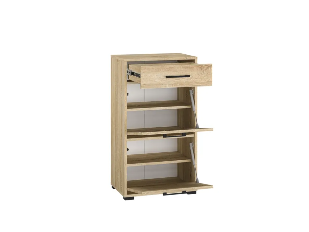 - Szafka na buty 50 cm CARO posiada szufladę o góry, pod którą znajdują się dwa uchylne fronty, gdzie każdy z nich został osadzony na siłownikach gazowych. Szafka wykonana z płyty laminowanej w kolorze dąb sonoma.