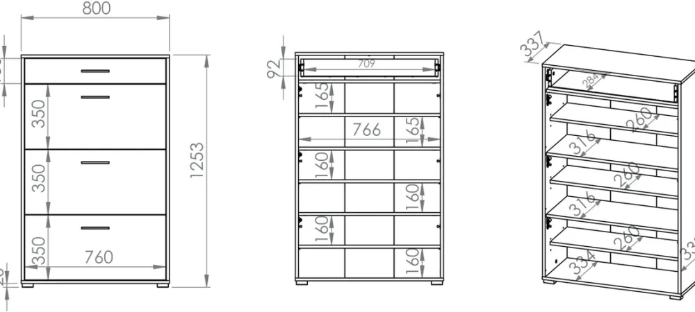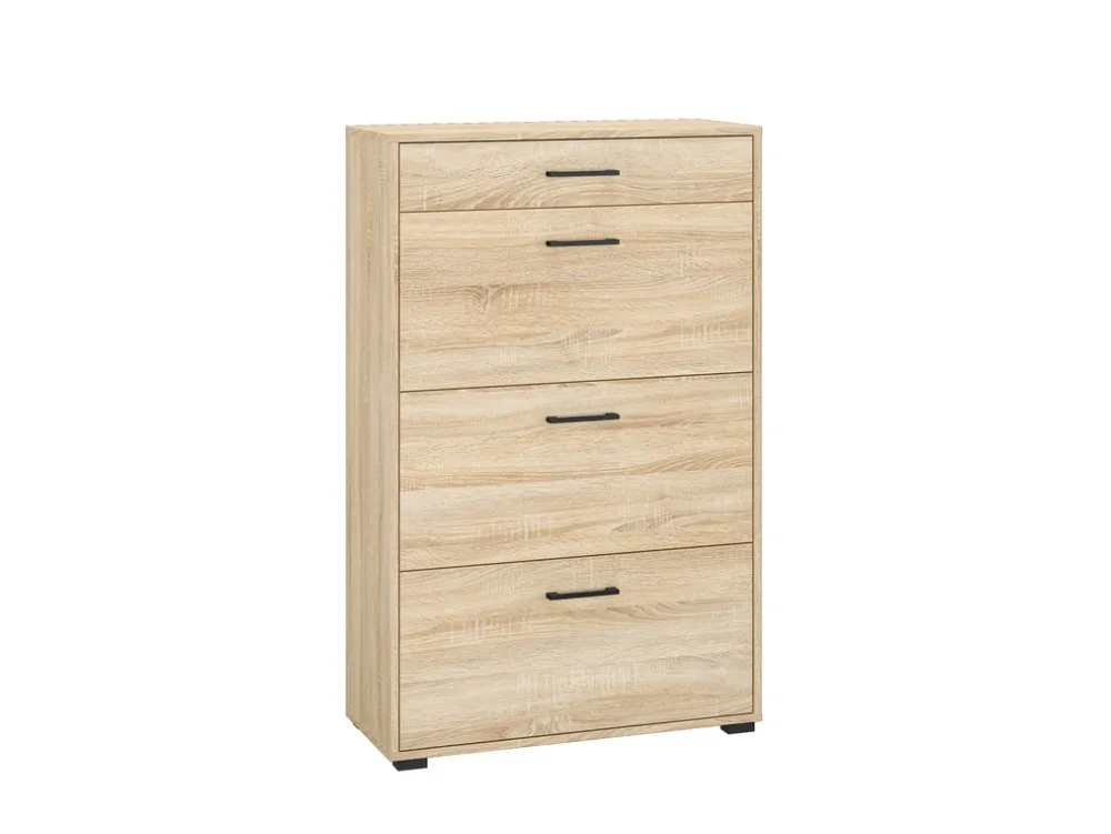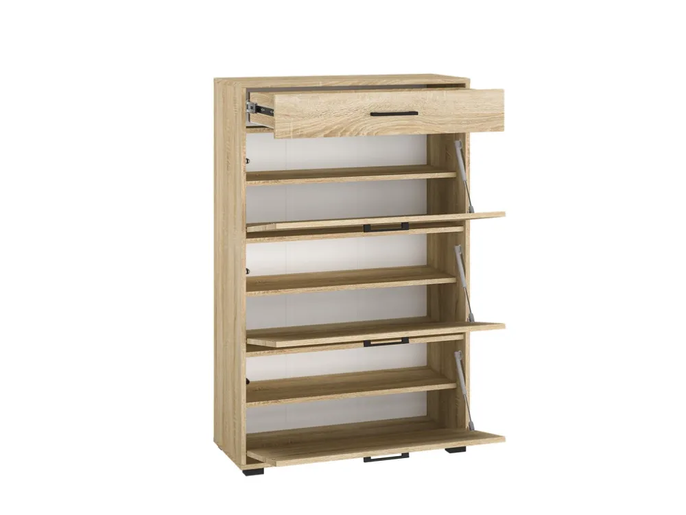 - Szafka na buty 80 cm CARO posiada szufladę u góry oraz trzy uchylne fronty na siłownikach gazowych poniżej. Za każdym uchylnym frontem znajdują się dwie półki na buty i akcesoria. Korpus oraz front szafki wykonano z płyty laminowanej w kolorze dąb sonoma.