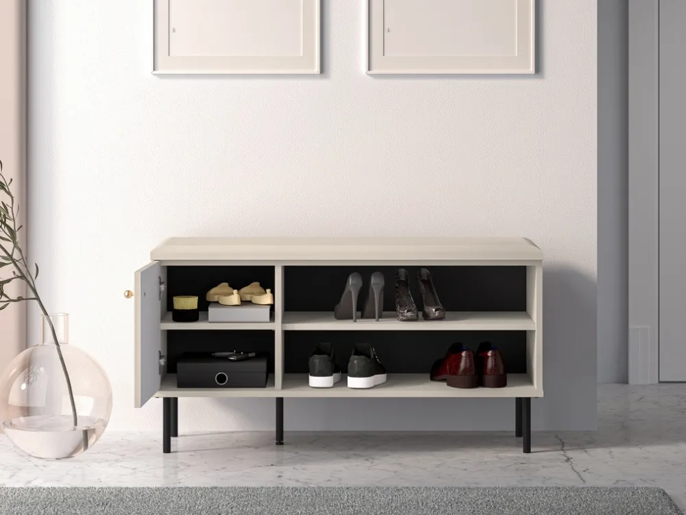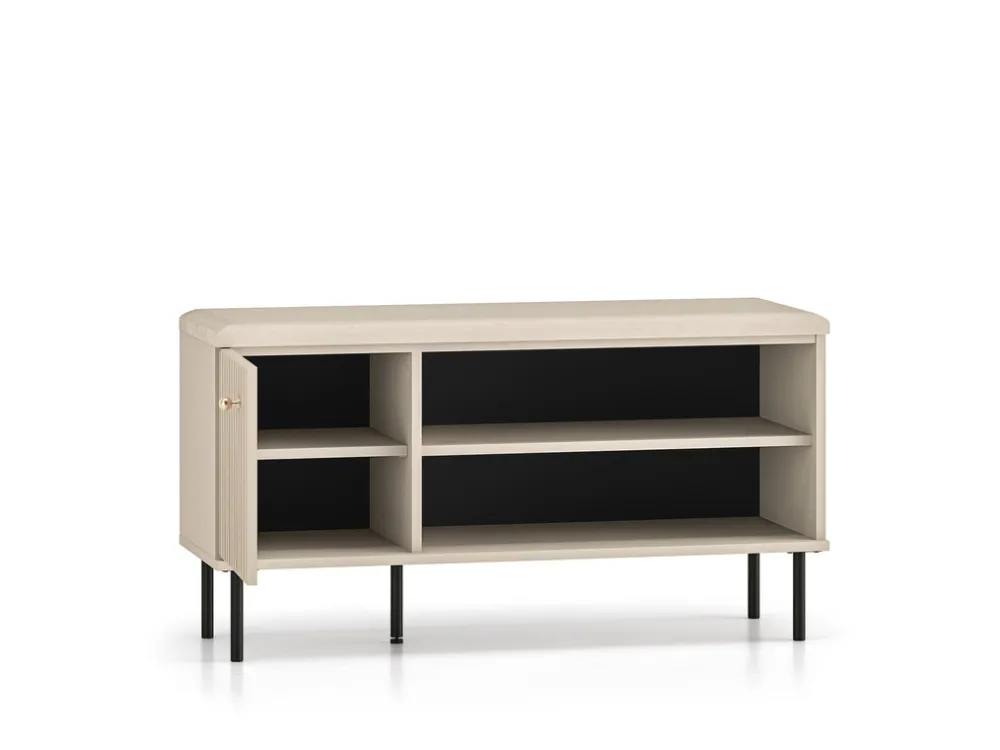 - Duża szafka na buty SOPHIE cashmere łączy styl z funkcjonalnością. Oferuje 2 półki otwarte i 2 zamknięte za frezowanymi drzwiami, złote uchwyty oraz czarne metalowe nóżki. To elegancki mebel, idealny do uporządkowania obuwia w nowoczesnym przedpokoju.